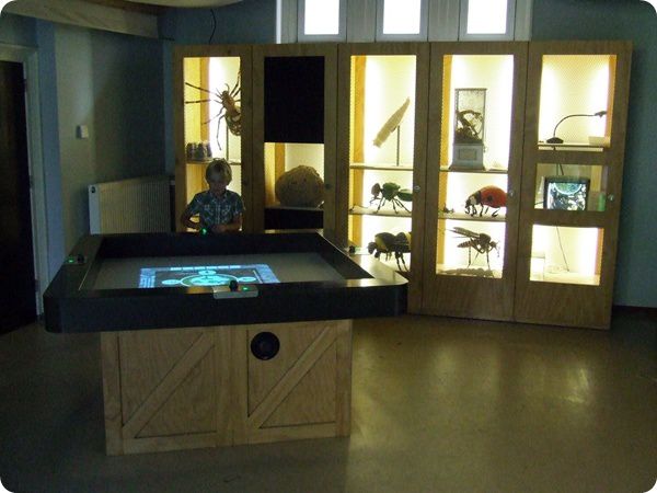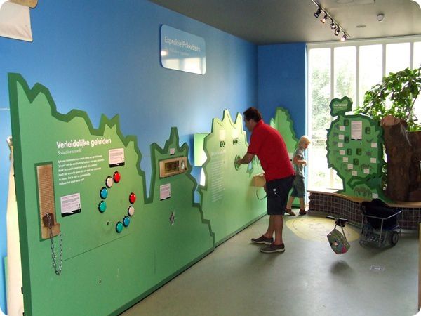 Az „Expeditie Prikkebeen” interaktív részlege. A jobb felső fotó hátterében látható nagyméretű rovarmodellek a tapintás segítségével viszik közelebb a rovarvilág csodáit a vak és gyengénlátó látogatók számára.