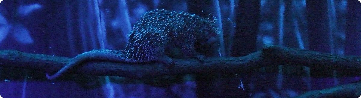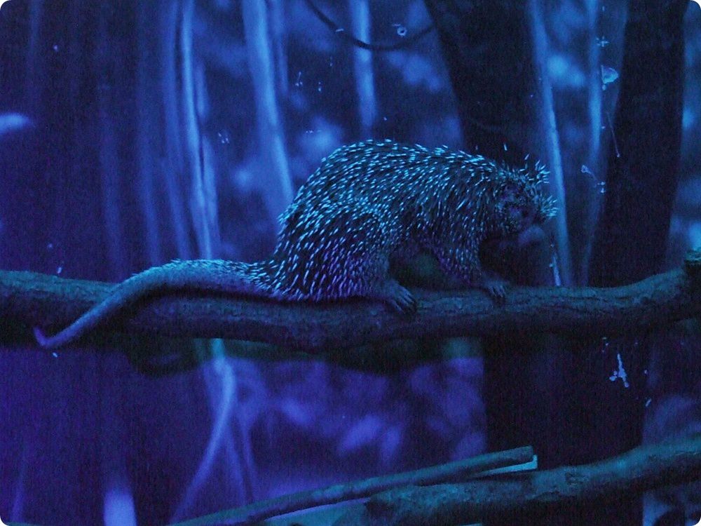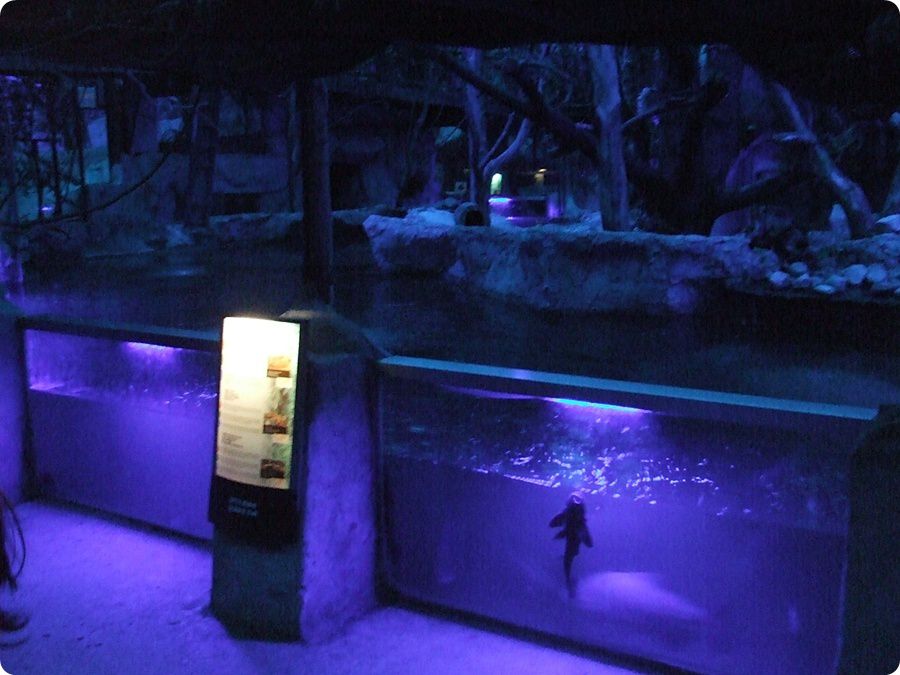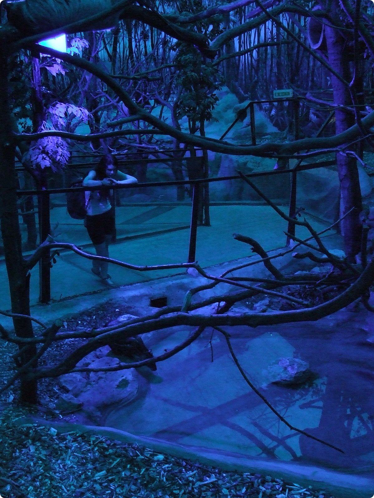 Az útvonal elején érdemes néhány percet szánni a nagyméretű fajtáblák átmustrálására, ezalatt szemünk is könnyen alkalmazkodik a teret uraló, a kék különböző árnyalatait felvonultató, holdfényt imitáló fényviszonyokhoz. A „megvilágítás” tekintetében nem az általános, zárt terekben használatos fényforrásokat alkalmazzák elsősorban: a csarnok áttetsző, kék színnel rendelkező tetőszerkezettel bír, mely nagy mértékben megszűri a természetes fényt, így alakítva ki a belsőben uralkodó színhatást. Ám térjünk vissza az állatgyűjteményre, a Nocturama bemutatott fajai a következők: