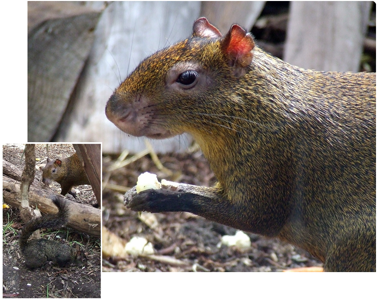 A relatíve közismertebb agutik (lent) sem hiányozhatnak a gyűjteményből, azonban a maja erdeimókusokkal (balra, fent) kizárólag itt találkozhatunk Európában. Jobbra fent az agutik, erdeimókusok és nemes papagájok közös bemutatója látható.