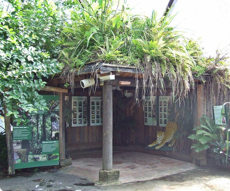 Belépés a Jungle Trek csarnokba (balra). A SNR területén megtalálható fajokat ismertető kiállítás részletes információkkal szolgál a látogatók számára (jobbra).