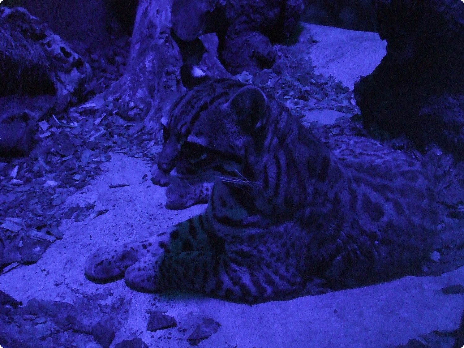 Az élénk és fürge majmokat elhagyva érkezünk meg az ocelotok kifutójához, mely meglepő módon nem egy zárt férőhely: egyik oldala csupán derékmagasságot nem sokkal meghaladó üvegfal, melyet az állatok felől egy nagyobb medence határol. Habár az ocelot egyike a leggyakrabban bemutatott kismacska-fajoknak Európában (közel 60 állatkertben megtalálható), korántsem nevezhető esetükben gyakori eseménynek a szaporulat. Az elmúlt egy évben mindössze három európai gyűjteményben volt gyermekáldás, valamint alig három hete itt, a Nocturamaban.