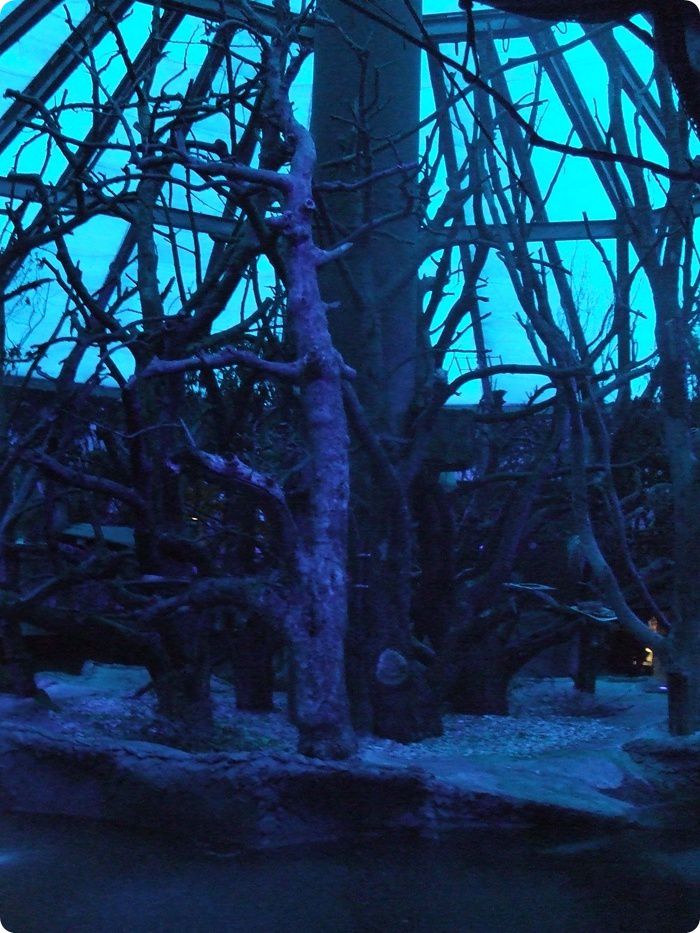 Balra lent a kétujjú lajhárok, nagy kúszósülök és pettyes pakák közös férőhelyének egy részletét tekithetjük meg. Az esztétikum fontos szempont volt a Nocturama kialakításánál, melyet az igényes dekorációs festés is szemléltet. Ezen felül nagy mennyiségben kerül felhasználásra műnövény, azonban ez a félhomályban nem ront a bemutató hitelességén.