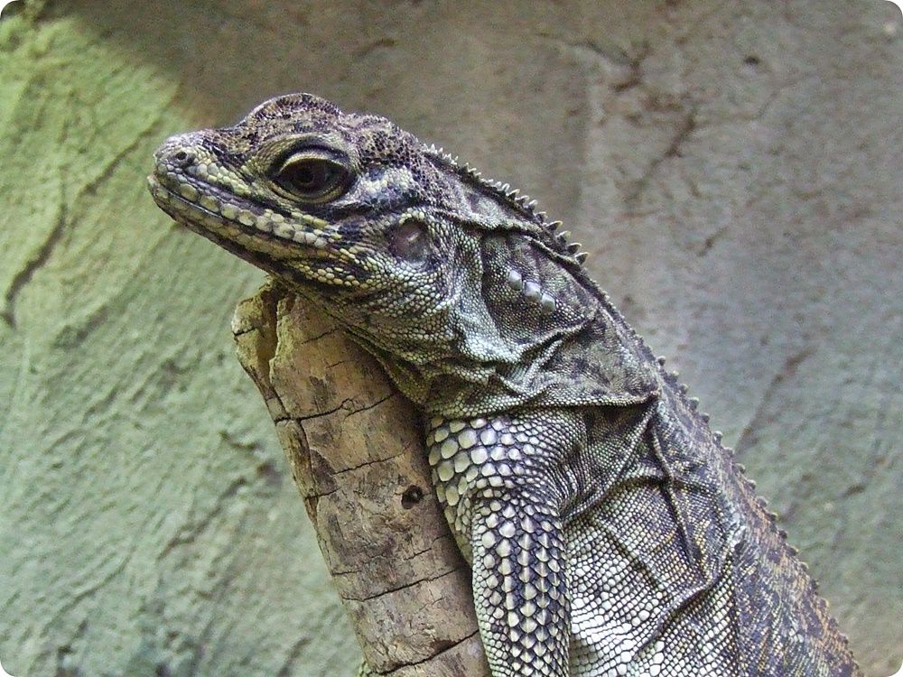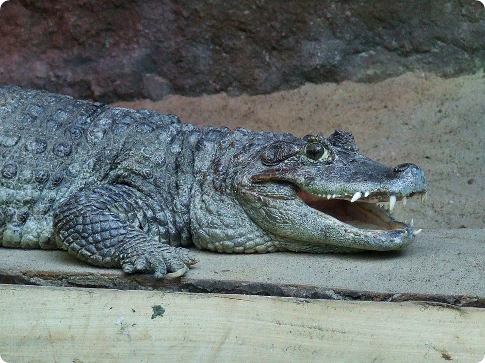 A krokodilféléket egy faj, a pápaszemes kajmán (Caiman crocodilus) képviseli. A kajmánmedencét elhagyva érkezünk meg az üvegház kiöblösödő központi csarnokához, mely egyben a hüllőbemutató kiemelt látványosságának számító komodói varánuszok (Varanus komodoensis) férőhelye. Jelenleg két 2004-es születésű nőstény egyed él itt, melyek 2005-ben érkeztek Poznanba a Spanyolországhoz tartozó Kanári-szigetek egyikén, a Gran Canarian létrehozott Reptilandia intzéményből. Egészen a közelmúltig egy 2012-ben Los Angeles-ből érkezett hímet is láthatott a nagyközönség az állatkert közpark területén, azonban ez az egyed 2017-ben elpusztult.