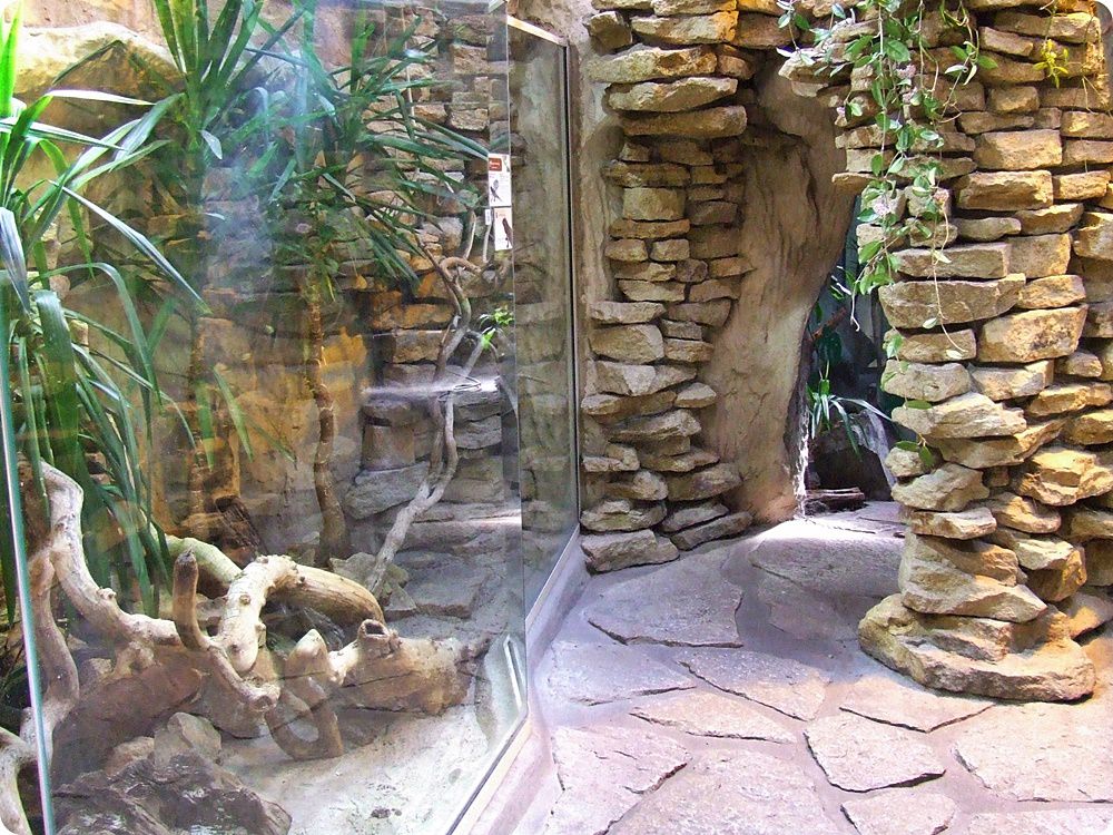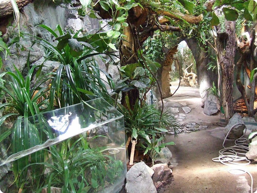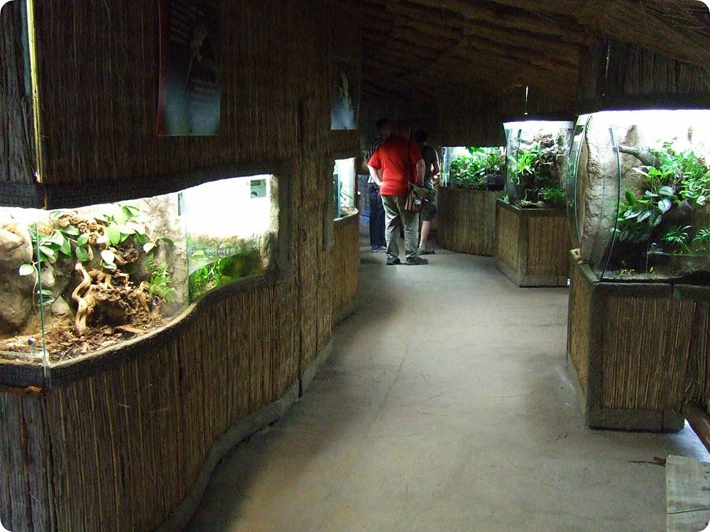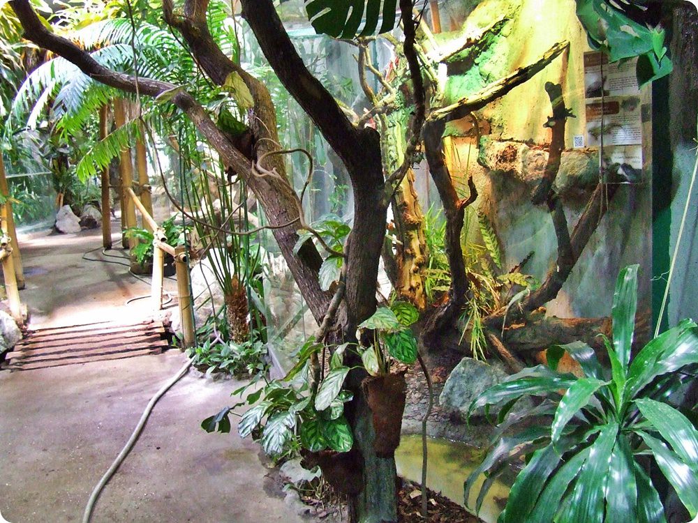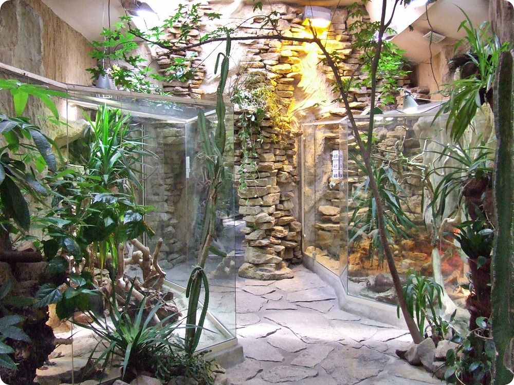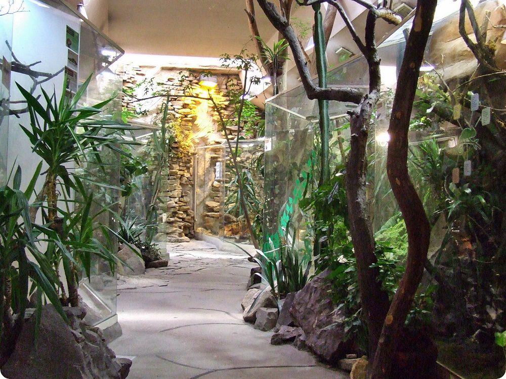 Továbbhaladva számos kisebb-nagyobb terrárium sorakozik a hangulatos, kanyargós látogatói útvonal mindkét oldalán. Az alapvető bemutatás-technika az élőhely szerinti felosztás, így első ízben a trópusok csapadékos, majd a félsivatagok száraz élőhelyein haladunk keresztül. A dekoráció vonatkozásában érdemes megemlíteni a terráriumok és közvetlen környezetük hasonló berendezését, mely megoldás némileg egybeolvasztja az állattartó- és látogatói teret. A hüllőbemutatók további jellemzője a társas-bemutatók kialakítása. A csarnokban az alábbi fajokkal találkozhatunk: