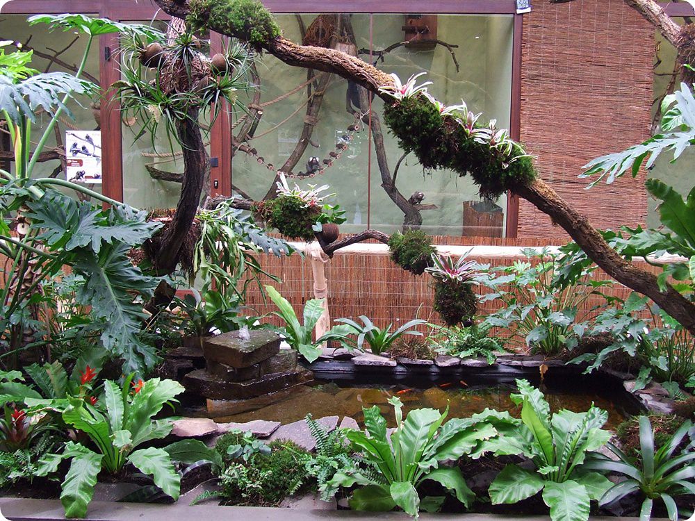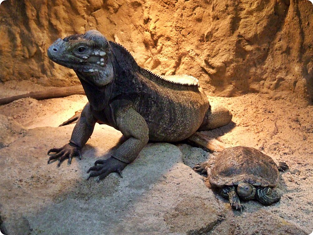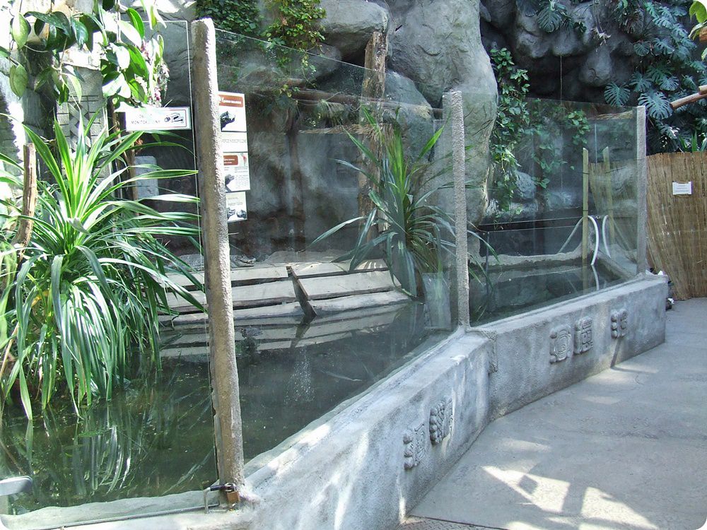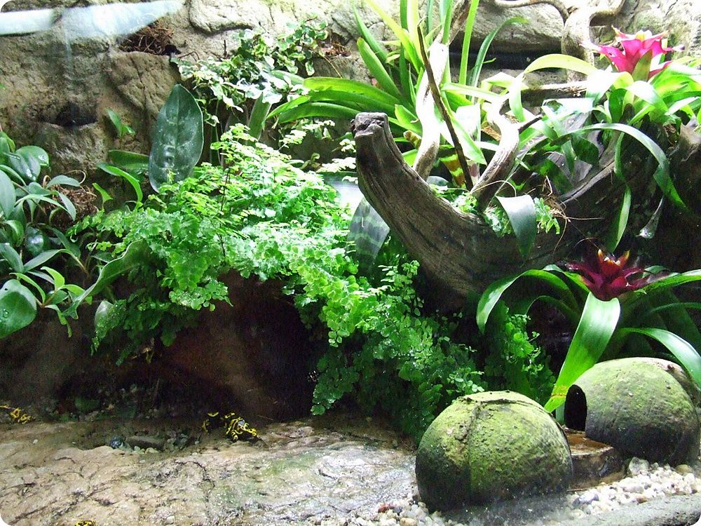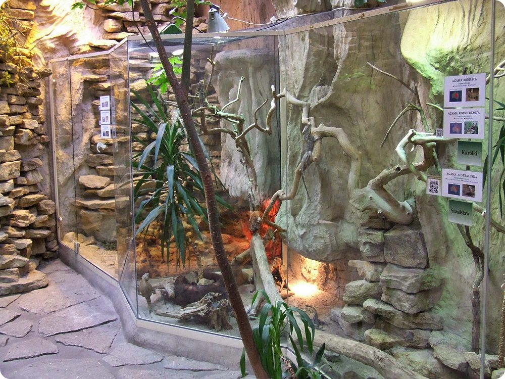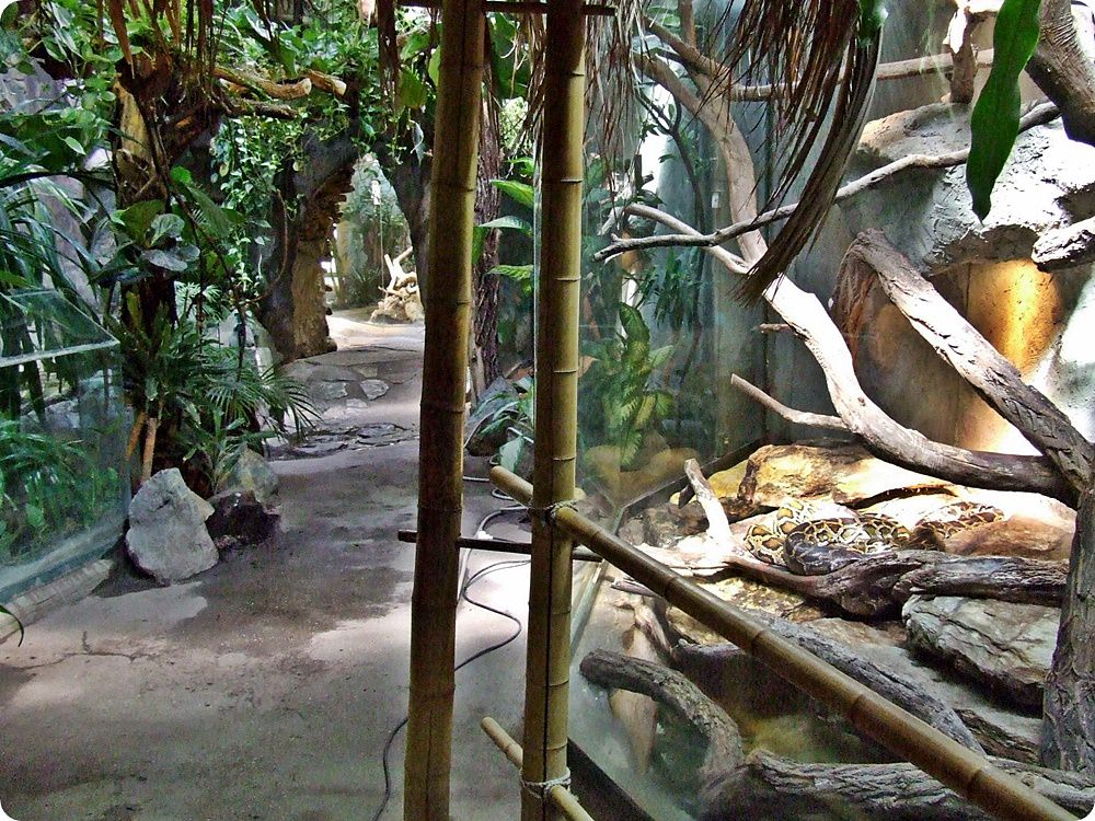 Továbbhaladva számos kisebb-nagyobb terrárium sorakozik a hangulatos, kanyargós látogatói útvonal mindkét oldalán. Az alapvető bemutatás-technika az élőhely szerinti felosztás, így első ízben a trópusok csapadékos, majd a félsivatagok száraz élőhelyein haladunk keresztül. A dekoráció vonatkozásában érdemes megemlíteni a terráriumok és közvetlen környezetük hasonló berendezését, mely megoldás némileg egybeolvasztja az állattartó- és látogatói teret. A hüllőbemutatók további jellemzője a társas-bemutatók kialakítása. A csarnokban az alábbi fajokkal találkozhatunk: