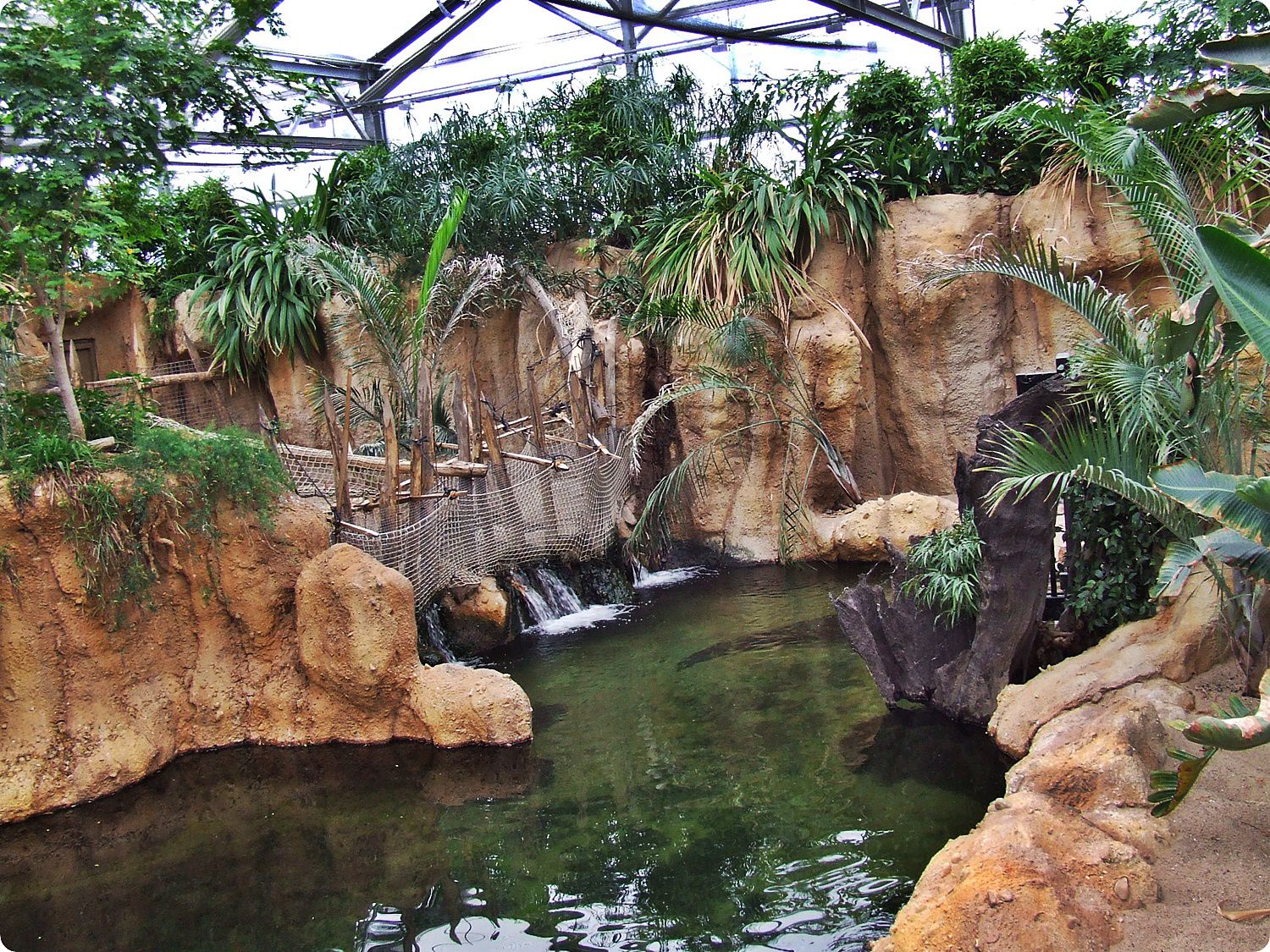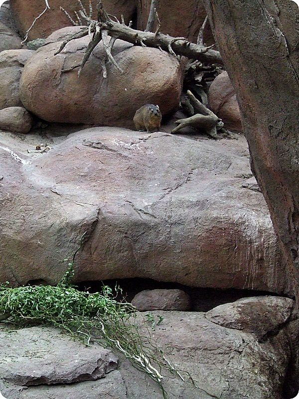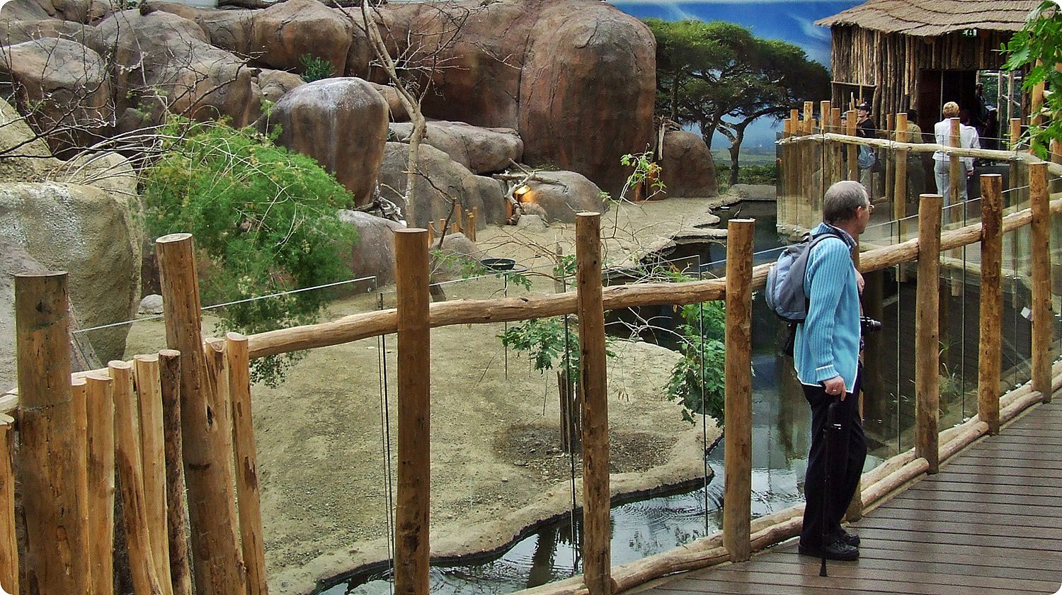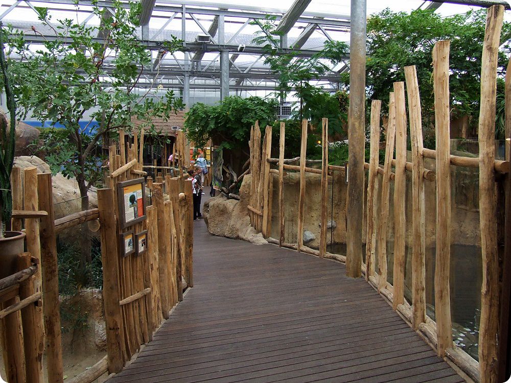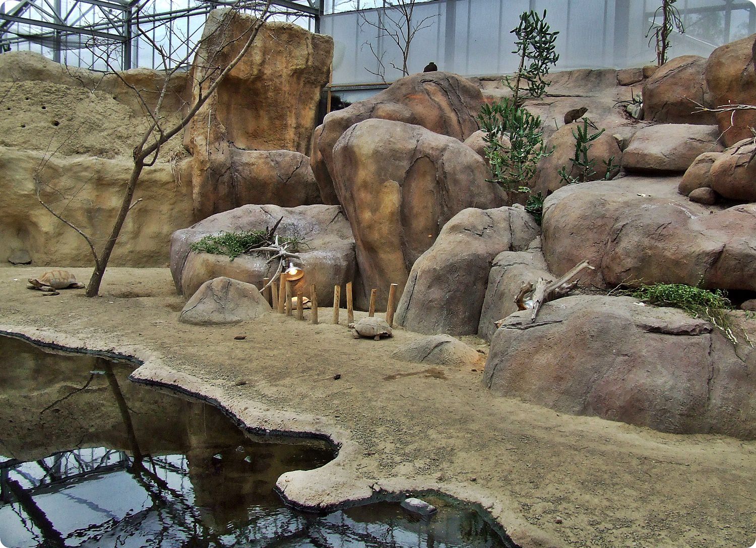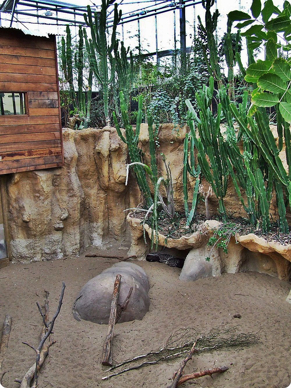 A Krokodilfolyó előcsarnokában a bőrpáncélosgyíkok és Peters-elefántcickányok számára kialakított kisebb kopje-bemutatók remekül illeszkednek a nagy csarnok sziklaformációihoz. A jobb oldali férőhely korábban hosszúfülű sünök (Hemiechinus auritus) és szürke csicsörkék (Serinus leucopygius) társas bemutatójaként funkcionált. A bal alsó felvétel forrása © www.zoochat.com