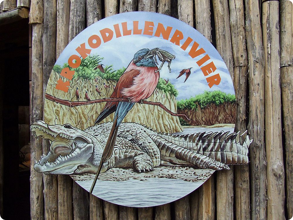A Krokodilfolyó-bemutató számos színvonalas, kisebb méretű fajtáblával és nagyobb méretű információs panellel felszerelt. Ez utóbbiak számos érdekességet, mint például a szirtiborzok evolúciós rokonságát, vagy, mint a tarajossülök, szurikáták és sarkanytús teknősök közös férőhelye esetében a területre jellemző kutyatejfélék (Euphorbiaceae) afrikai elterjedését ismerteti, mely növénycsoport néhány jellegzetes képviselőjét az állatok kifutójában is megfigyelhetünk. Jobbra egy kármin gyurgyalag látható, mely faj jelenleg már az „okapi-röpde” lakója.