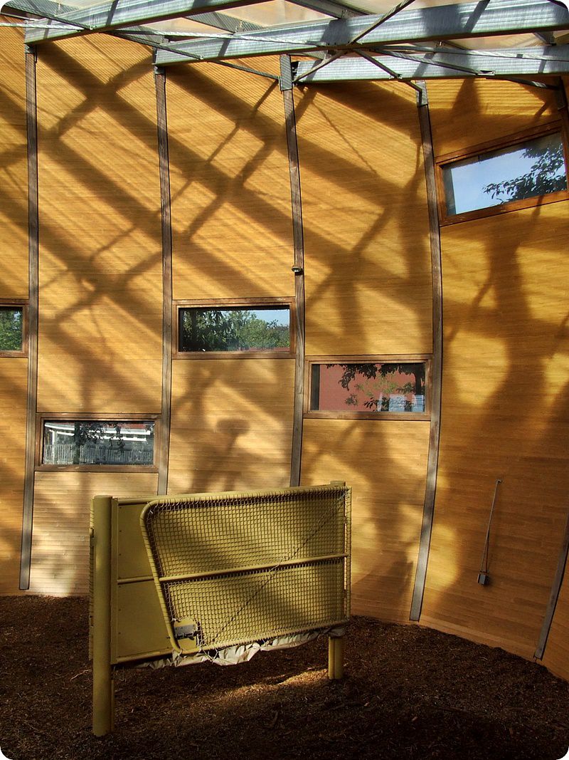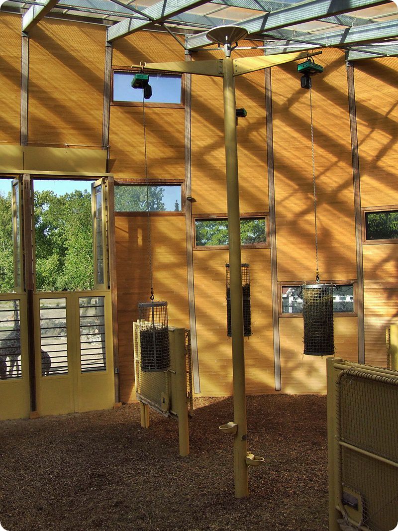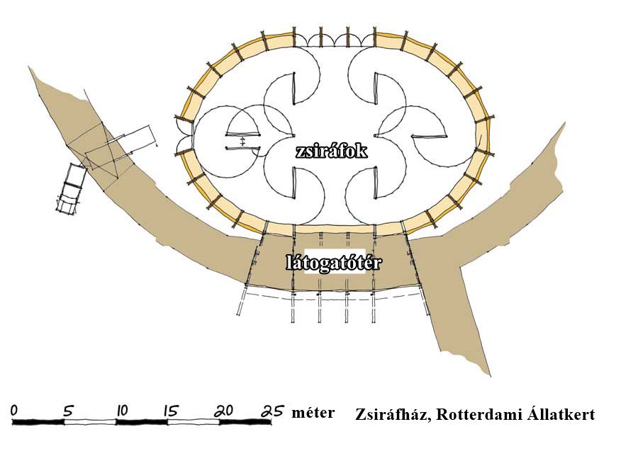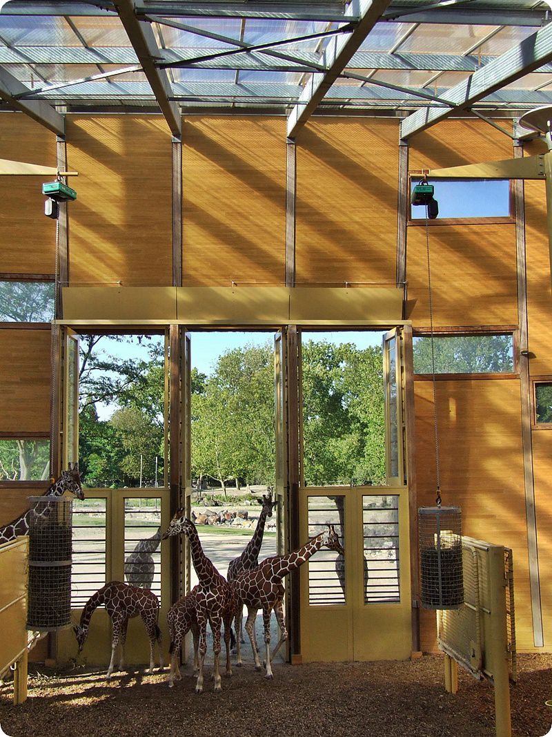 Érdemes néhány szót ejteni a Zsiráfház belső szerkezeti kialakításáról, mely lehetővé teszi a zsiráfok igény szerinti elkülönítését. A felvételeken és az ábrán látható fix elemek rányitható ajtókkal rendelkeznek, így számos opció áll rendelkezésre a belső tér tagolása tekintetében. A látogatók a kifutó nagy részén és az épületben is emelt útvonalról tekinthetik meg az állatokat. Az alsó felvétel és ábra forrása © LAM Architects