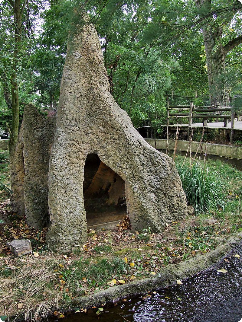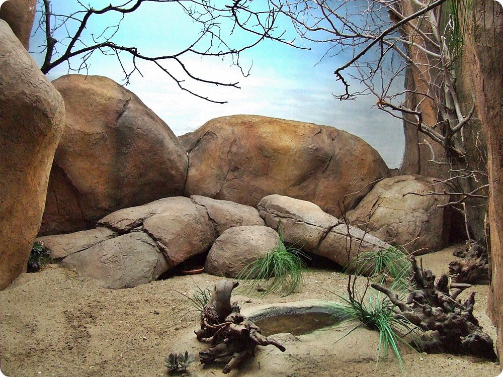 A kopje-bemutatót határoló tavacskában termetes afrikai harcsák (Clarias gariepinus) úszkálnak. Mint a felvételen is látható, korábban a sarkantyús teknősök is e bemutatóban kaptak helyet. A jobb alsó felvétel forrása © www.zoocrew.eu