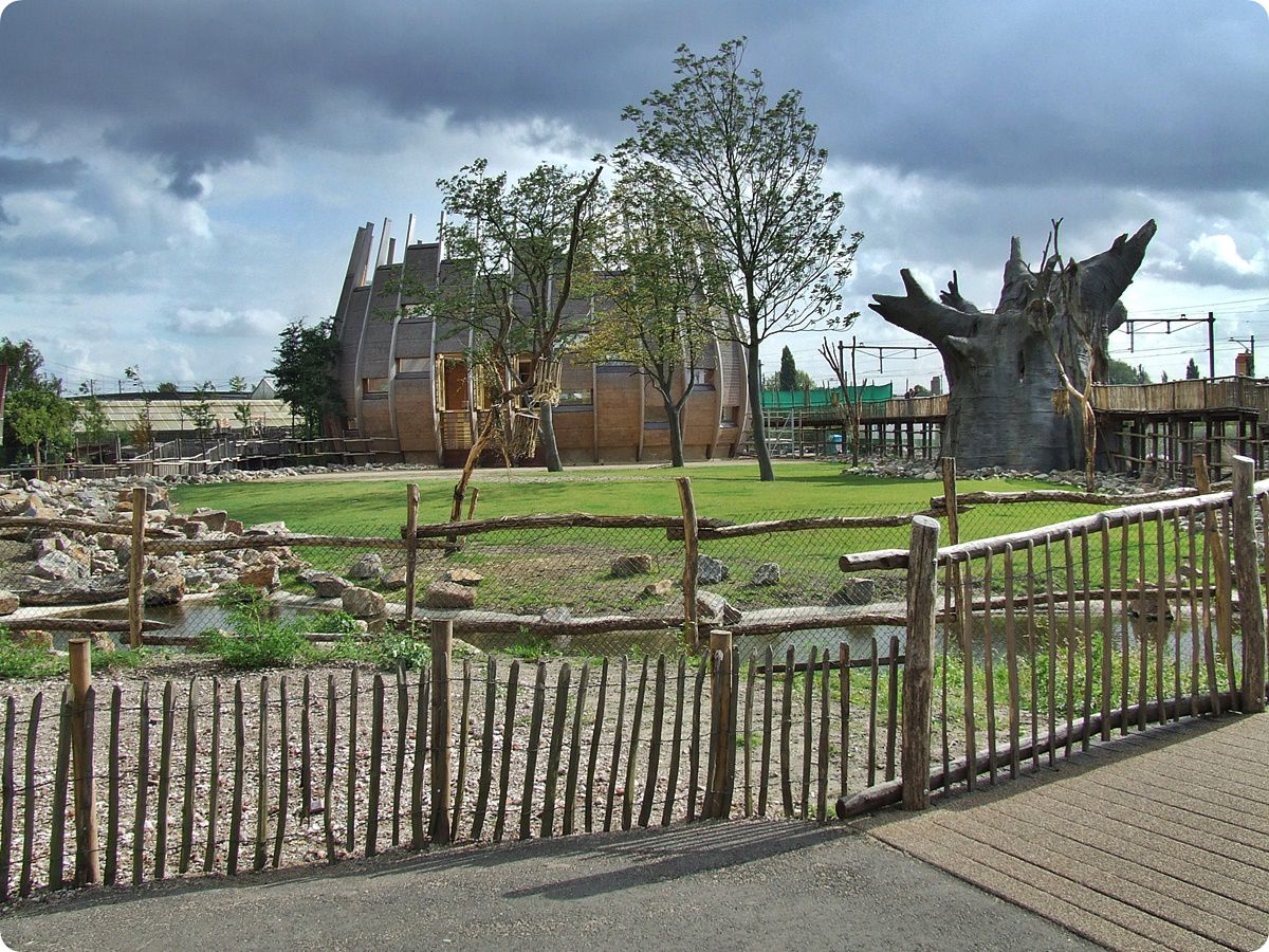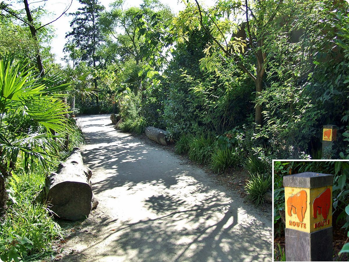Az állatkert afrikai tematikájú bemutatóit a narancssárga gorilla sziluettel jelzett „Gorilla ösvényen” járhatjuk végig. A felvételen az emberszabásúak kifutója mentén húzódó látogatói útvonal egy részletét láthatjuk.