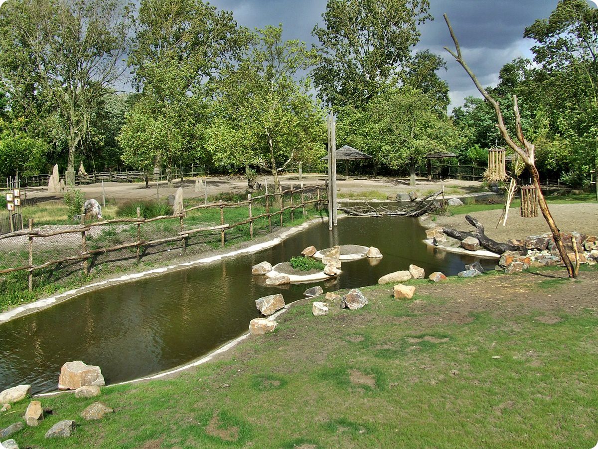 A kifutó külső ívén felhalmozott nagyméretű sziklák megakadályozzák a területen élő patásokat, hogy túl közel kerülhessenek a látogatói útvonalhoz. Az alsó felvételeken a zebrák és zsiráfok térrészét elválasztó sziklasáv egy része és a vizesárok látható.
