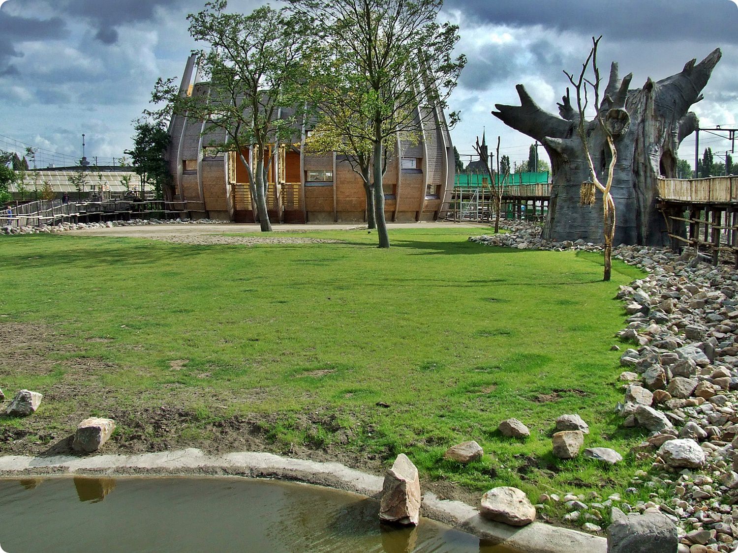A rotterdami szavanna látképe a Zsiráfházzal és mű baobabfával