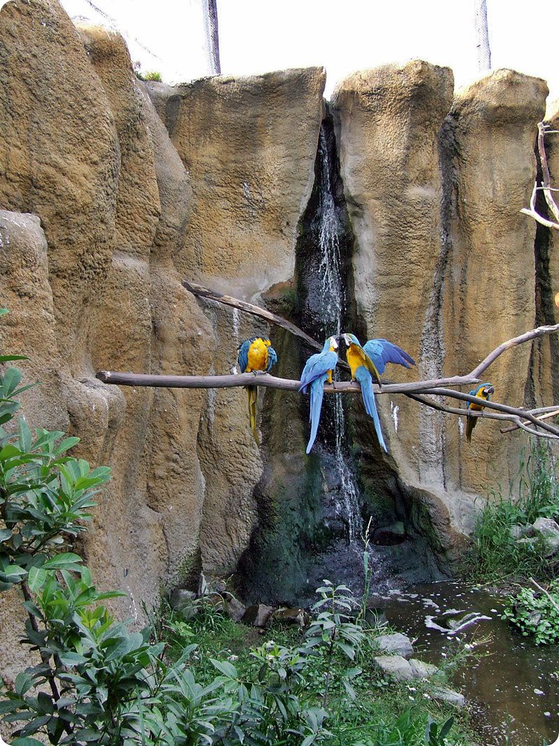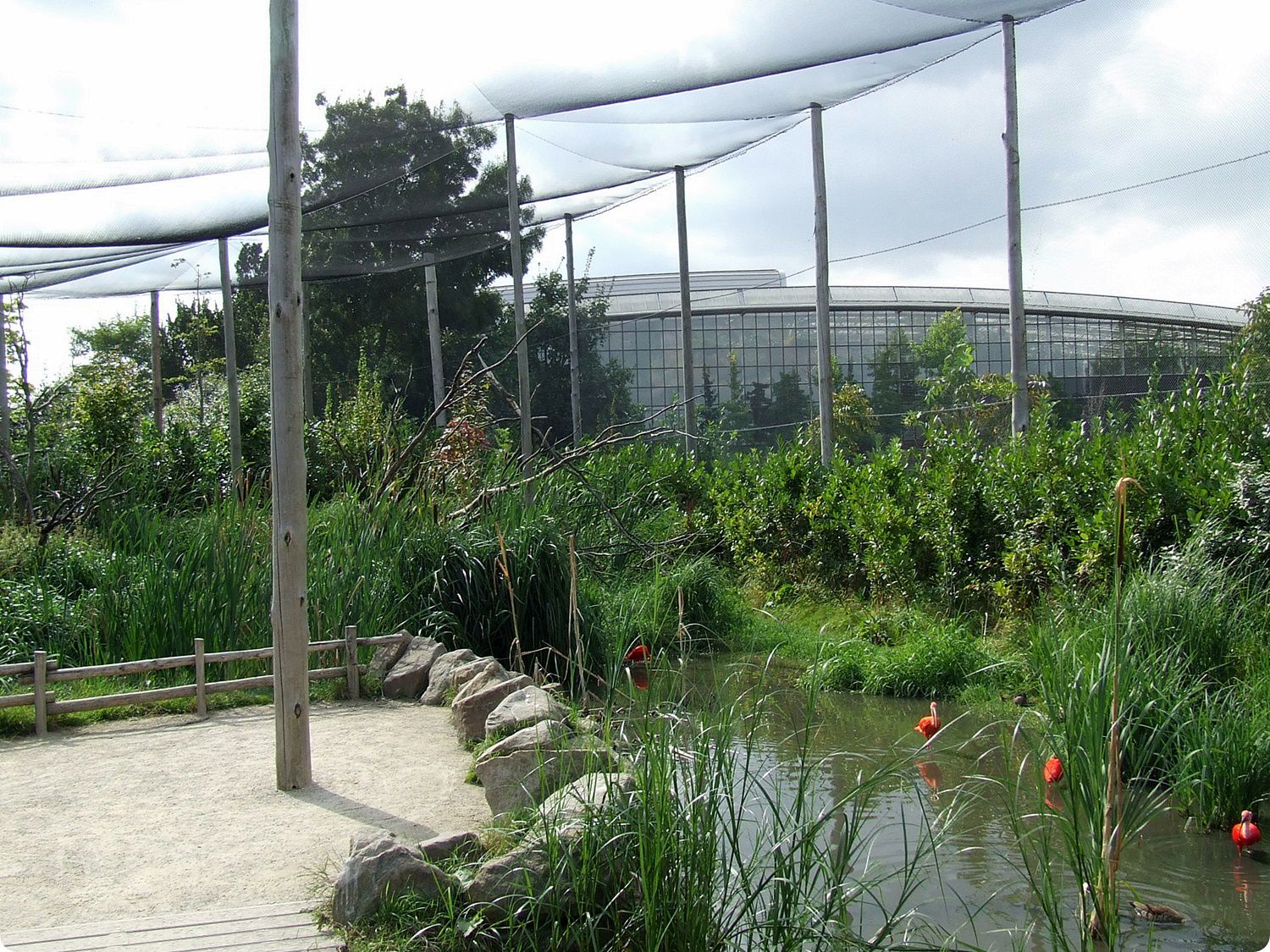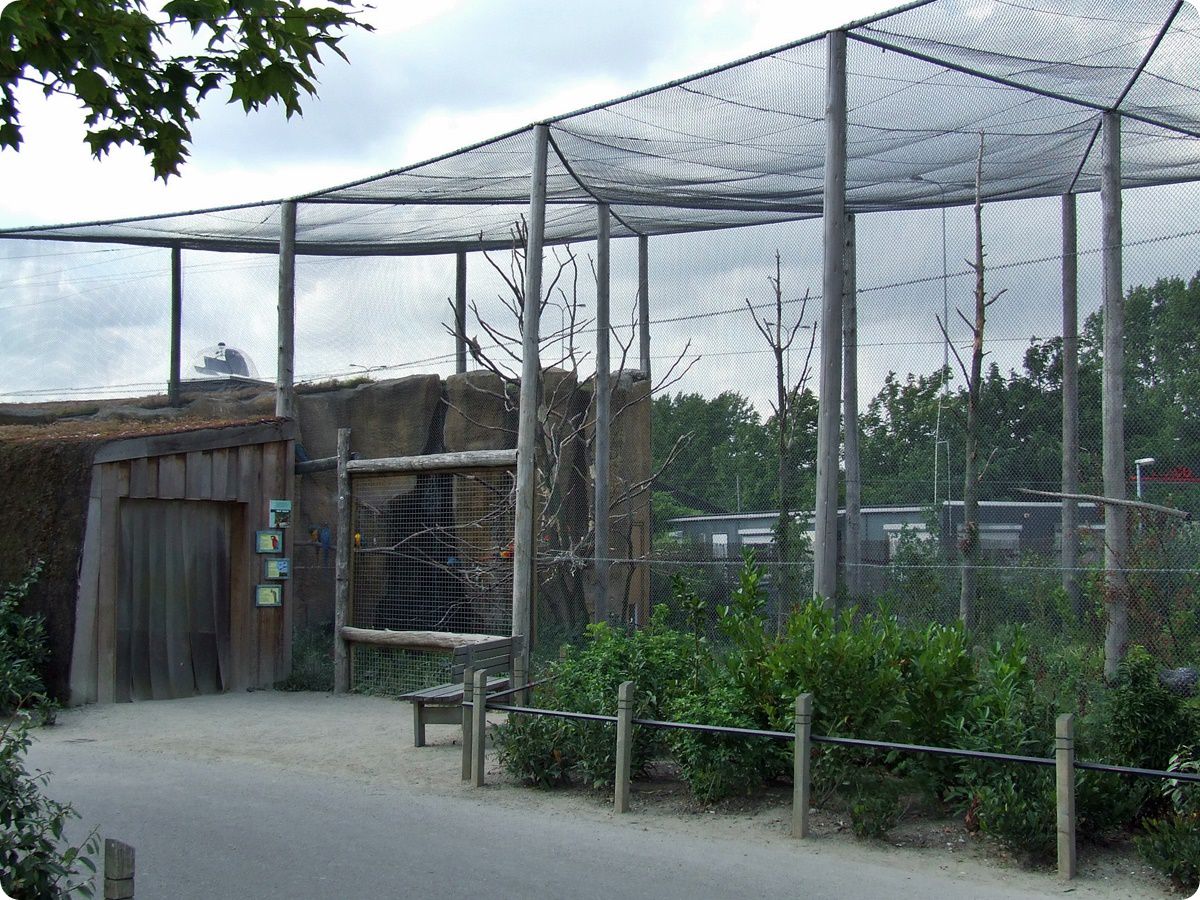 Az impozáns méretű röpdébe besétálva közelről tanulmányozható a dél-amerikai madarak életmódja. A skarlátíbiszek belső férőhelye szintén természethű háttér dekorációval bír. Jobbra lent egy fiókáját nevelő egyed látható.