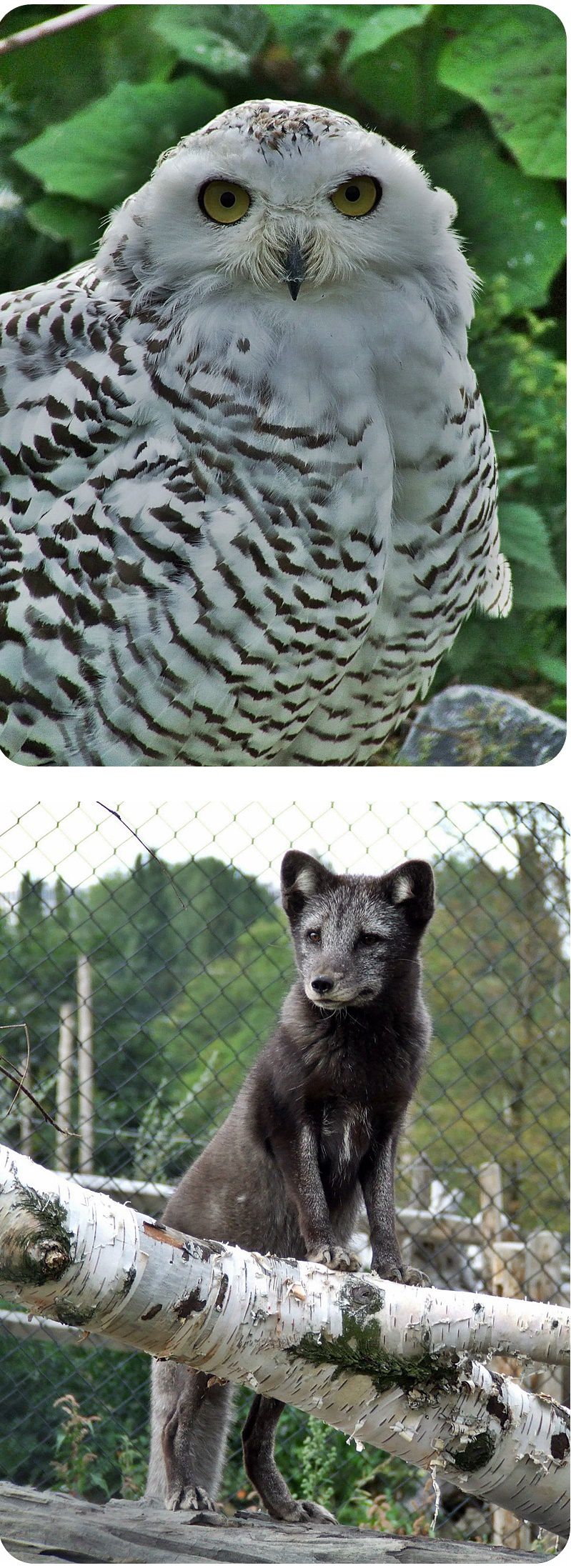 Felül egy hóbagoly tojó és röpdéje, középen sarki rókák és kifutójuk, alul pedig egy óriás rétisas és röpdéje látható.