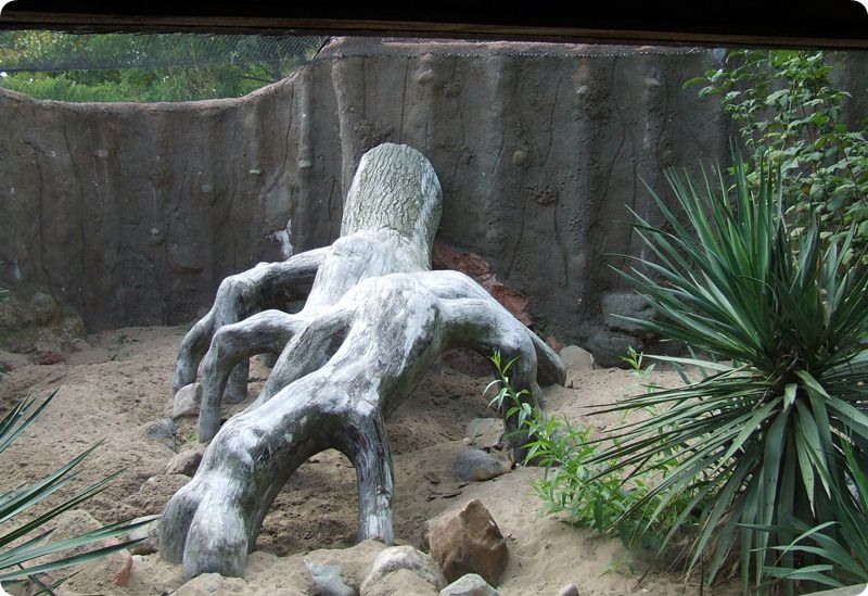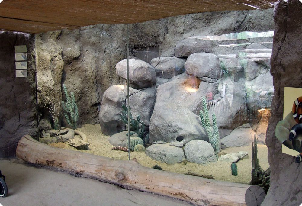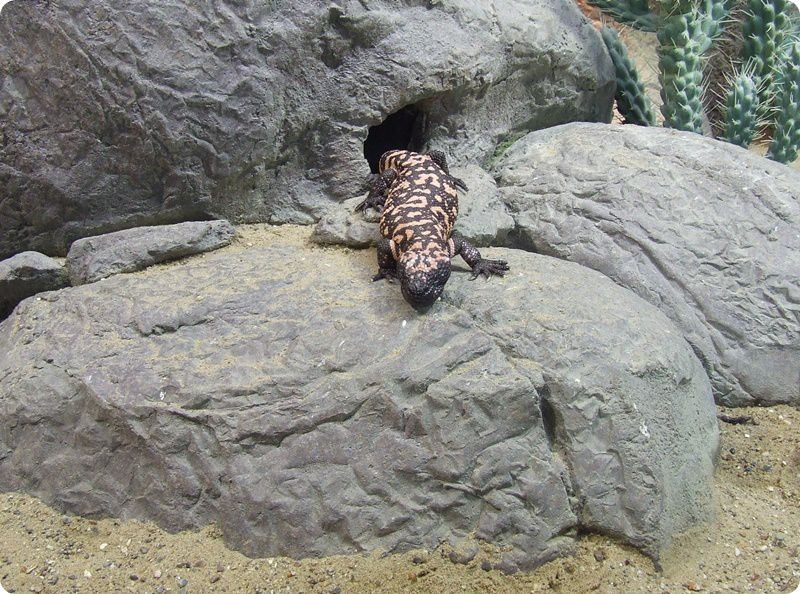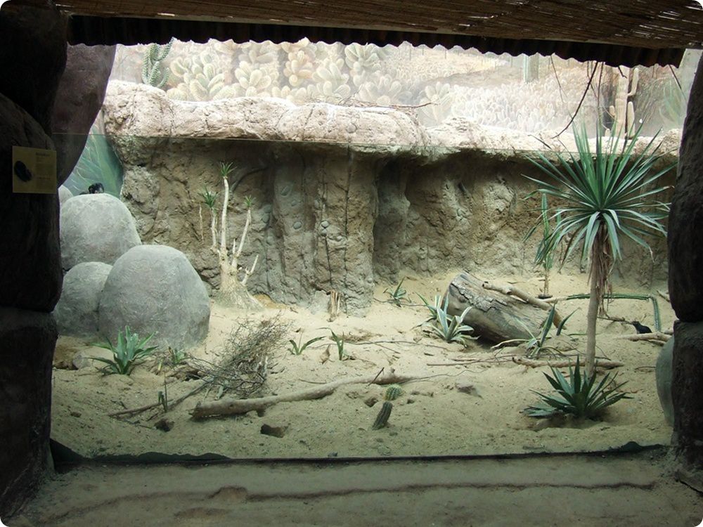A gilák, gallérok díszesleguánok és kukvalák közös férőhelye igazán látványos, és igen nagy mozgásteret biztosít a gyíkoknak. Balra fent egy gila, jobbra pedig egy nagy futókakukk látható.