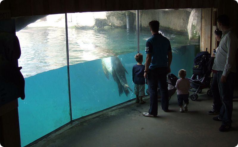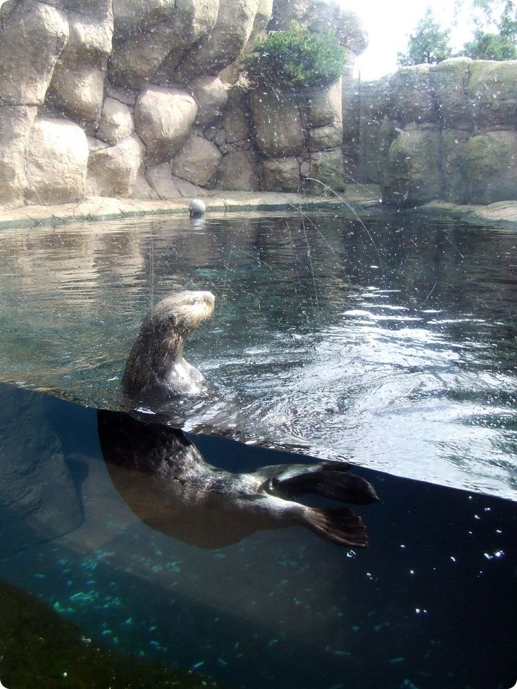 A sivatag megtekintése után visszatérünk a Kaliforniai-öbölbe, mely az Oceanium utolsó bemutatóegysége. Az itt található tengeri hínárerdők szintén igen gazdag élővilágot tartanak el, a Blijdorp ezek két meghatározó tengeri emlős faját, a kaliforniai oroszlánfókákat (Zalophus californianus) és a tengeri vidrákat (Enhydra lutris) mutatja be. Pontosabban, a Lisszaboni Ócenáriumban született, 2002-ben és 2005-ben érkezett két nőstény vidra 2010 novemberétől ismét a portugál intézmény lakója, mely jelenleg az egyetlen európai állatkert, amely ezt a különleges vidrafajt bemutatja. Rotterdamban, jelenlegi helyükön egy lazacféle kerül bemutatásra. 2009-es látogatásomkor a vidrák azonban még a Blijdorp-ban vendégszerepeltek, így volt szerencsém megtekinteni a Mustelidae család legtermetesebb faját. Általánosságban elmondható, hogy a rozsomákot szokás a legnagyobb menyétfélének nevezni, ám a tengeri vidra hímek olykor 45 kilogrammos testtömegükkel jóval felülmúlják mind a rozsomák, mind az óriásvidra tömegét. Meglepően termetesek, tulajdonképpen a legkisebb fókafaj, a Bajkál-fóka kisebb egyedeinek súlyát is megközelítik!