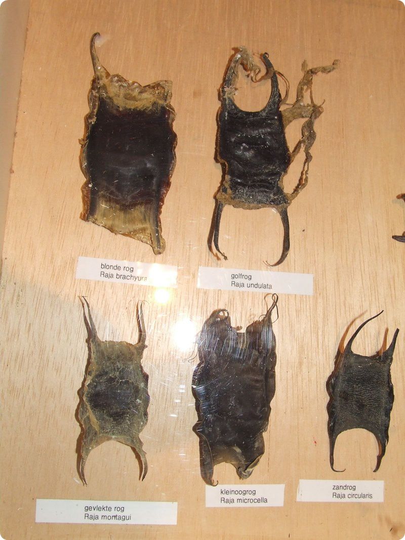 Jobbra néhány rájafaj tojásait láthatjuk, fentről, balról sorban: Raja brachyura, Raja undulata, Raja montagui, Raja microcella, Raja circularis