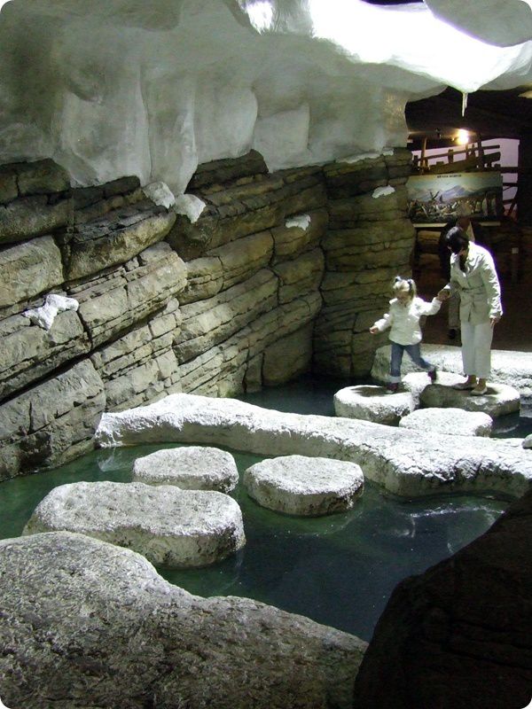 A gyönyörű madarak úszását azonban nem pusztán „szokványos módon”, üvegen keresztül csodálhatjuk meg. Az üvegbetekintők mellett kialakított területen mozgó, mesterséges jégtáblákon kelhetünk át, melyről letekintve felülről is láthatjuk a pingvinek úszását. A bemutatót elhagyva egy újabb szigetre vezet utunk…