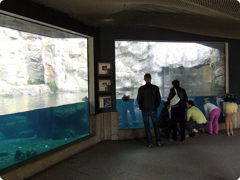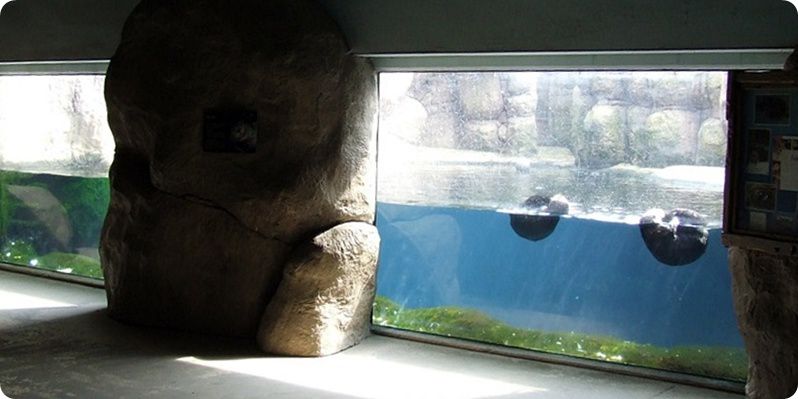 Tengeri vidrák bemutatója az Oceanium Kaliforniai tengeri hínárerdők elnevezésű részlegében. Látogatásomkor, 2009 nyarának végén a két nőstény vidra testtömege 23 és 26 kilogramm volt. Jobbra fent az oroszlánfóka-medence látható, melyre nem csak kintről, hanem bentről is nagyszerű panoráma nyílik.