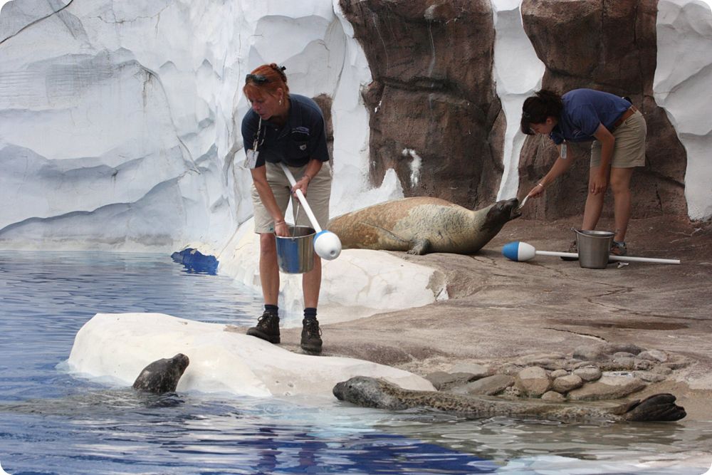 Koppenhágában borjúfókák nőstény csapatát mutatták be közösen egy rénszarvas csapattal. A fajokat időszakosan sem kellett elkülöníteni. A szarvasok át tudtak menni a kövekből épült barrieren és inni a fókák medencéjéből. Néhány alkalommal megfigyelhető volt, hogy a szarvasok úsznak a fókamedencében (HAMMER 2002).