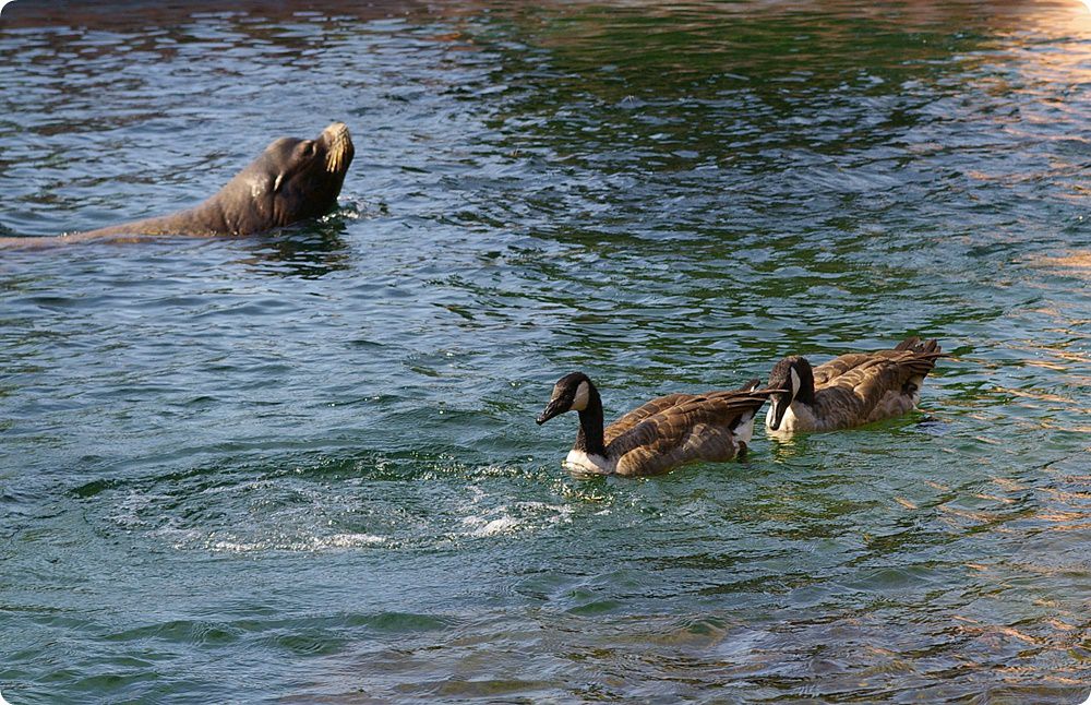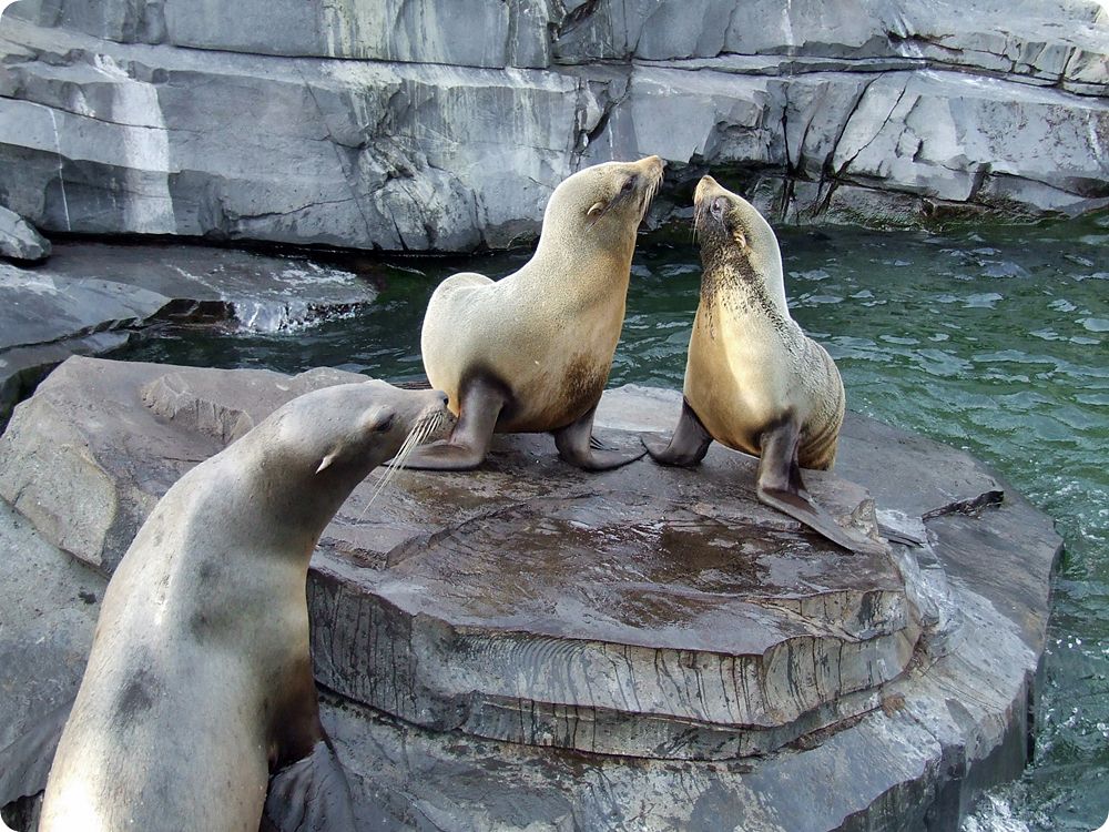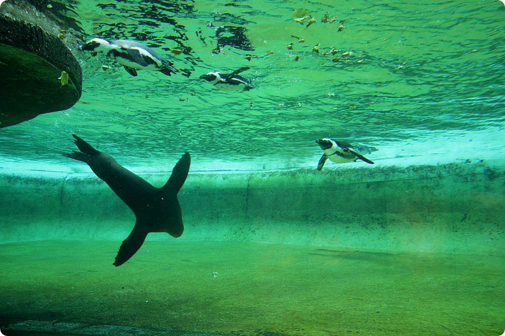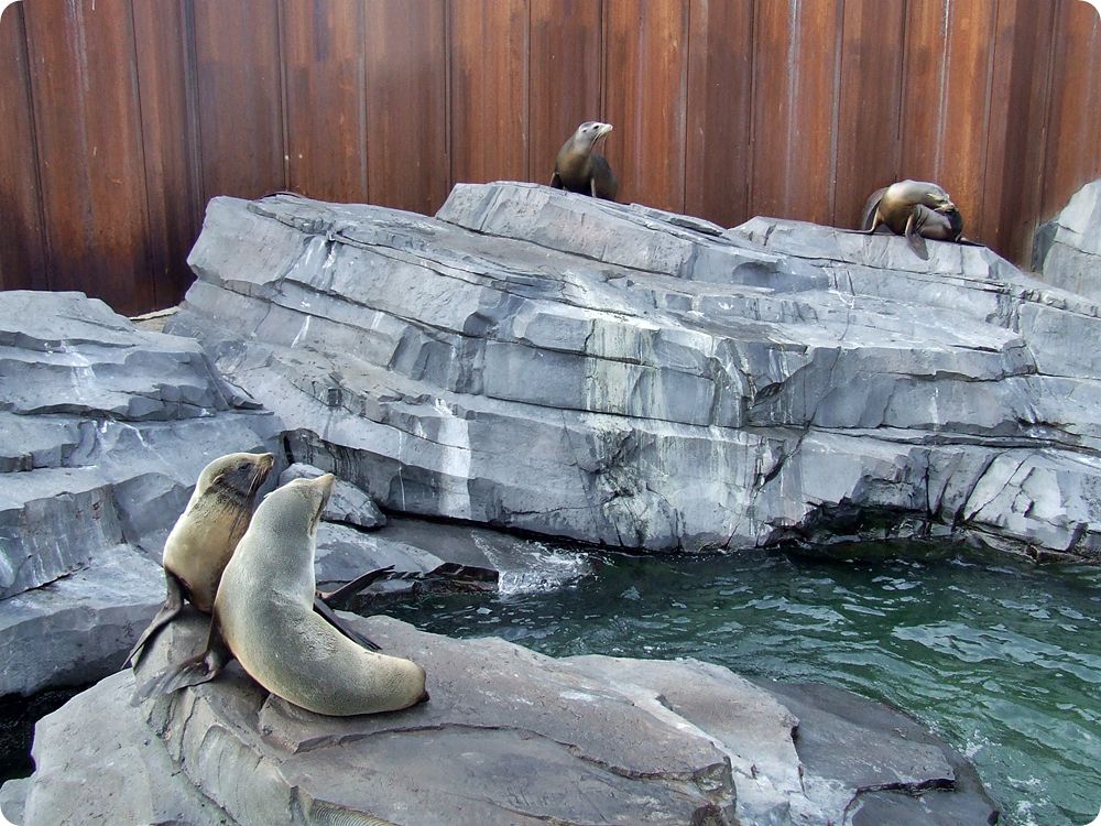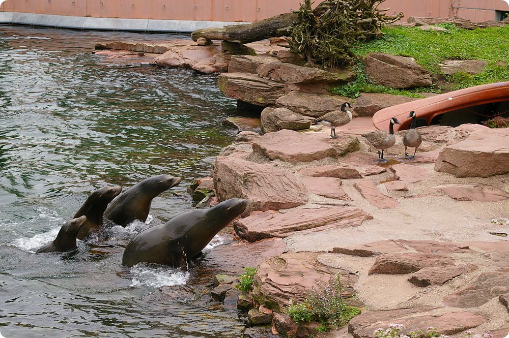 Nürnbergben kaliforniai oroszlánfókák szaporodó csapata látható együtt két nőstény borjúfókával, mely problémamentesen működik. A bemutatóban nem szándékolt társítás eredményeképpen időnként több madárfaj – szürke gém, kanadai lúd és tőkés réce – egyaránt megfigyelhető. A récék már szaporodtak és neveltek fel fiókákat. A fiatal oroszlánfókák lenyomták a réce fiókákat a víz alá, majd hagyták őket ismét a felszínre jönni. E rendszeres és durva játékos magatartást azonban sikeresen túlélték a fiókák (MÄGDEFRAU 2018, sz. k.).
