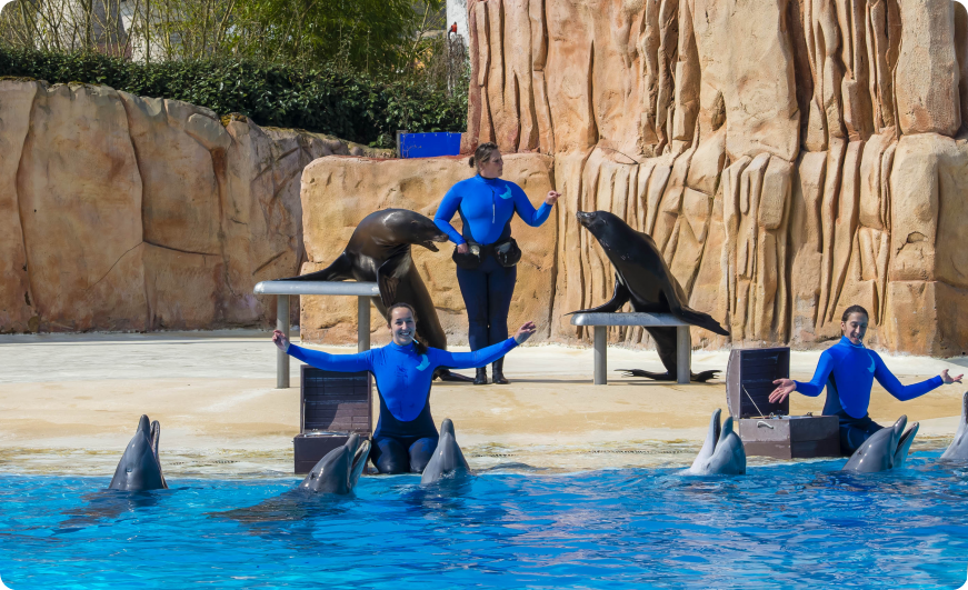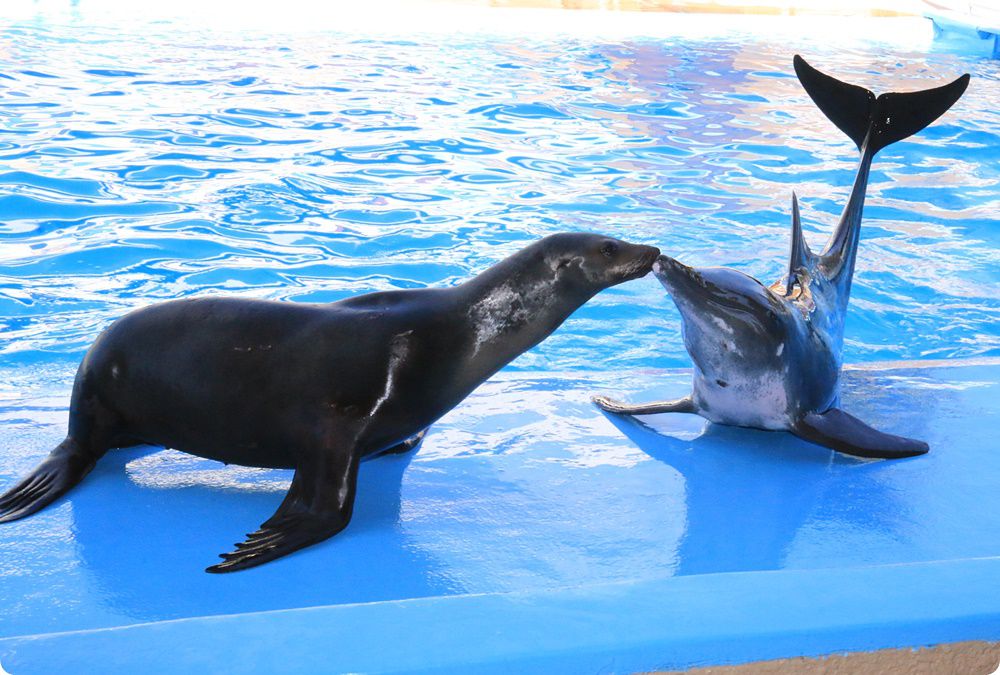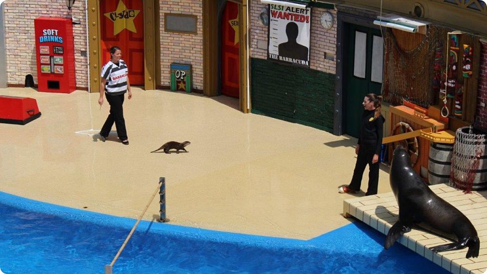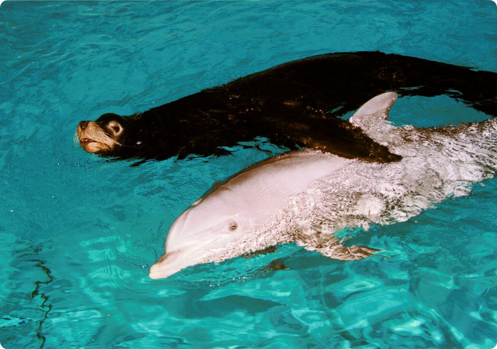 Habár az oroszlánfókák és delfinek közös tartása a legtöbbször préblémamentes és egy igen attraktív bemutatót eredményez, a vezető delfintrénerek hangsúlyozzák, hogy a fókáknak elegendő számú helyen el kell tudniuk hagyni a vizet szükség esetén. E menekülési pontok igen fontosak, mivel a delfinek néha igen durván játszanak. Továbbá ajánlott a borját nevelő nőstény oroszlánfóka elkülönítése mindaddig, amíg a fiatal fóka elég gyors a delfinek elől történő meneküléshez (HAMMER 2002).