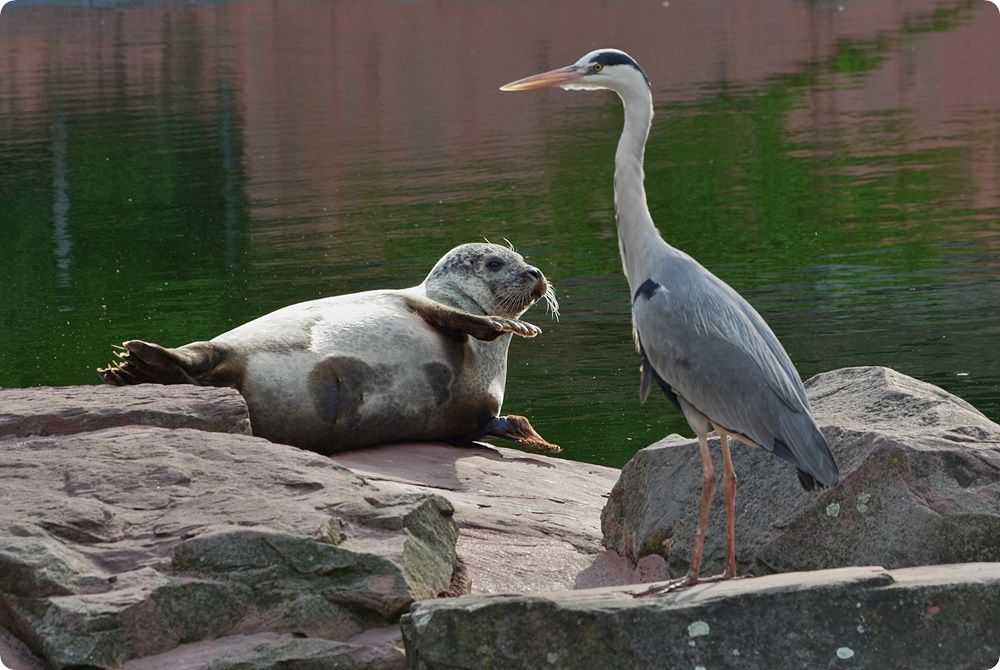 Számos madárfaj - a felvételen egy szürke gém (Ardea cinerea) - látogatja szabadon a borjúfókák (Phoca vitulina) és kaliforniai oroszlánfókák közös medencéjét Nürnbergben