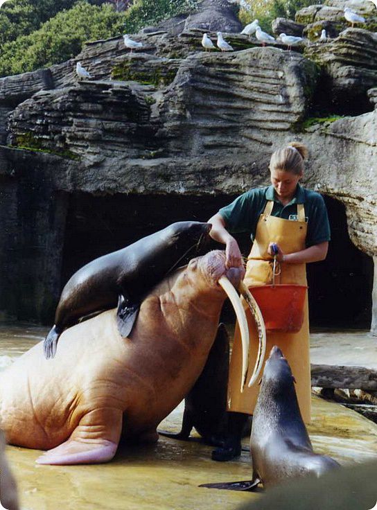 PUSCHMANN (1983) beszámol egy hat éves rozmár és oroszlánfókák, valamint kúpos fóka együtt tartásáról.
