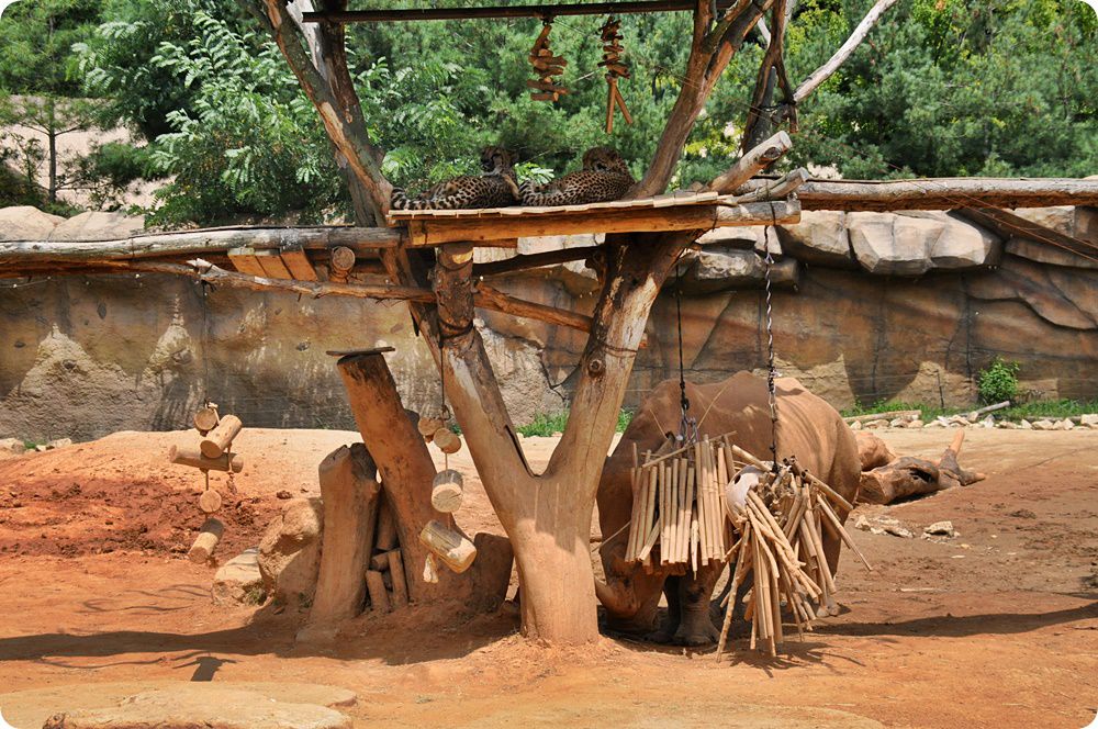 Egy sztenderdnek nevezhető kifutó – a környezetgazdagítást jelentő etetési módszerek alkalmazása mellett is – rövid időn belül unalmassá válhat az állatkerti gepárdok számára. Egy másik faj jelenléte, mint például a viszonylag nyugodt vérmérsékletű szélesszájú orrszarvú kiváltképp alkalmas lehet egy társítás kialakítására. Az orrszarvúk alapvetően figyelmen kívül hagyják a gepárdokat, azok pedig óvatosan, ám láthatóan nyugodtan mozognak a nagytestű növényevők közelében (HAMMER 2002). Az egyik első példa e kombinációra a svéd Boråsi Állatkert volt, ahol egy 7000 m²-es kifutó áll az állatok rendelkezésére, melyen belül egy emelt területrészre vonulhatnak el a gepárdok. A pozitív tapasztalatok eredményeképpen napjainkban egyre több intézményben láthatjuk e fajkombinációt.