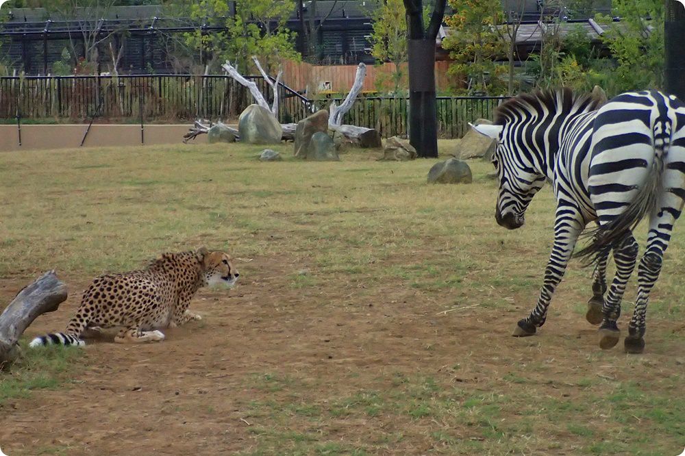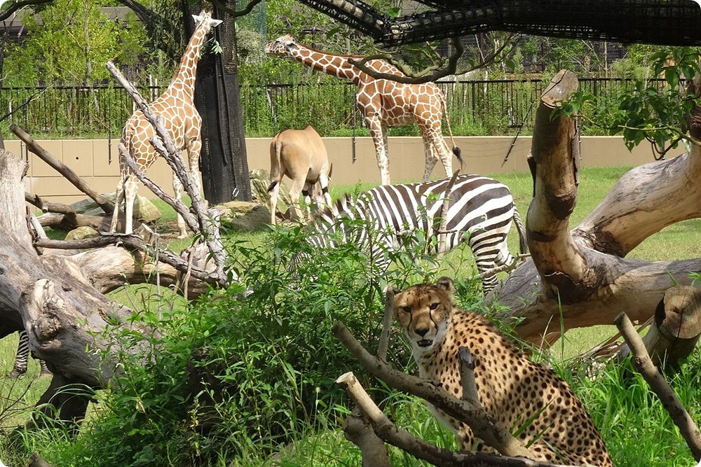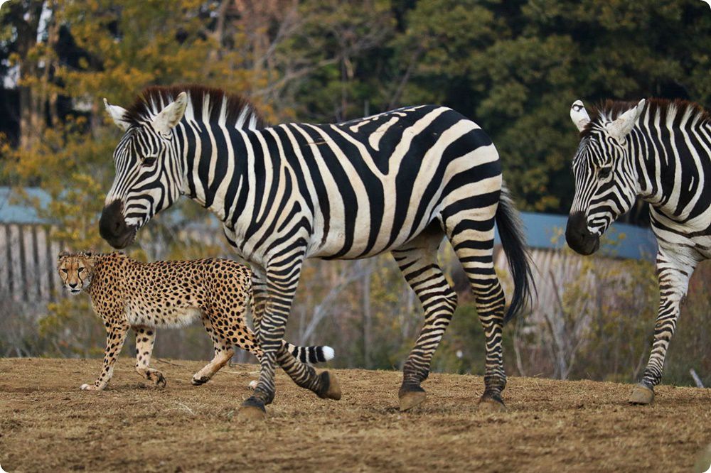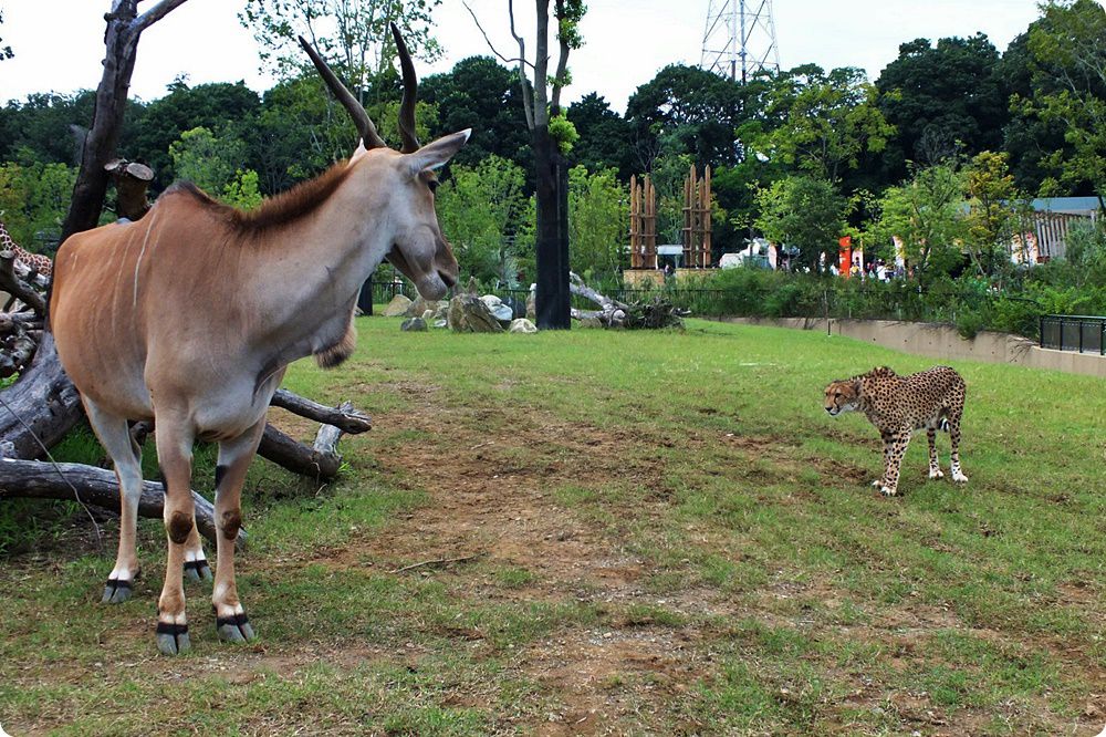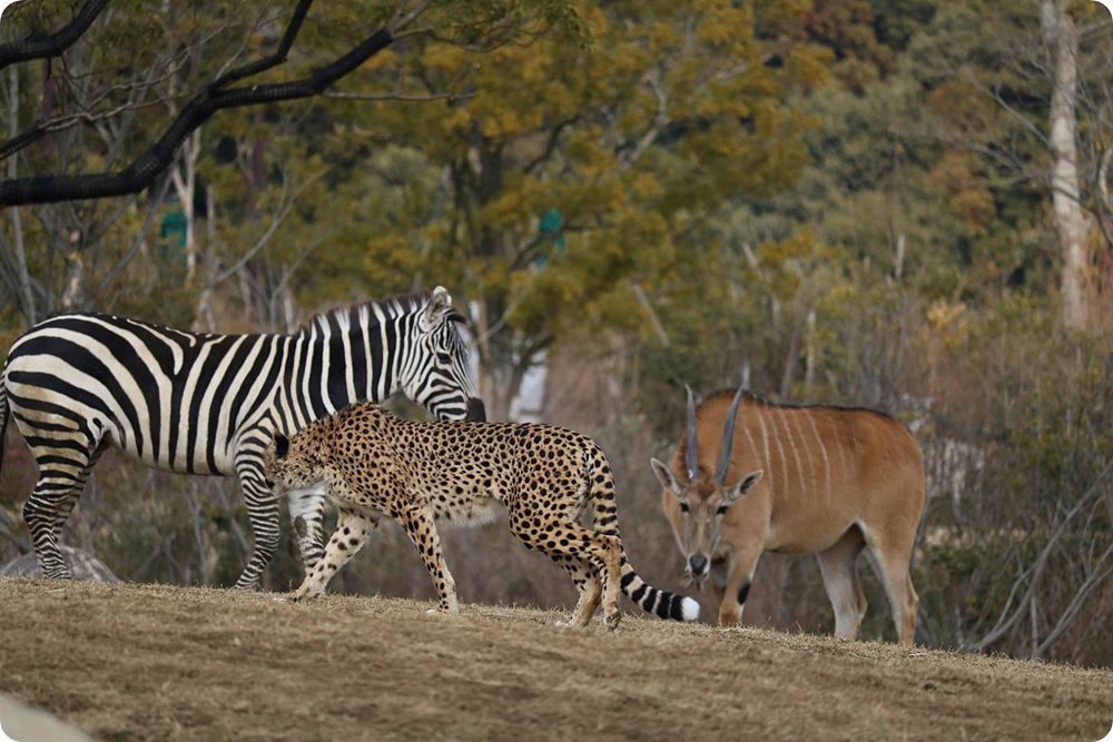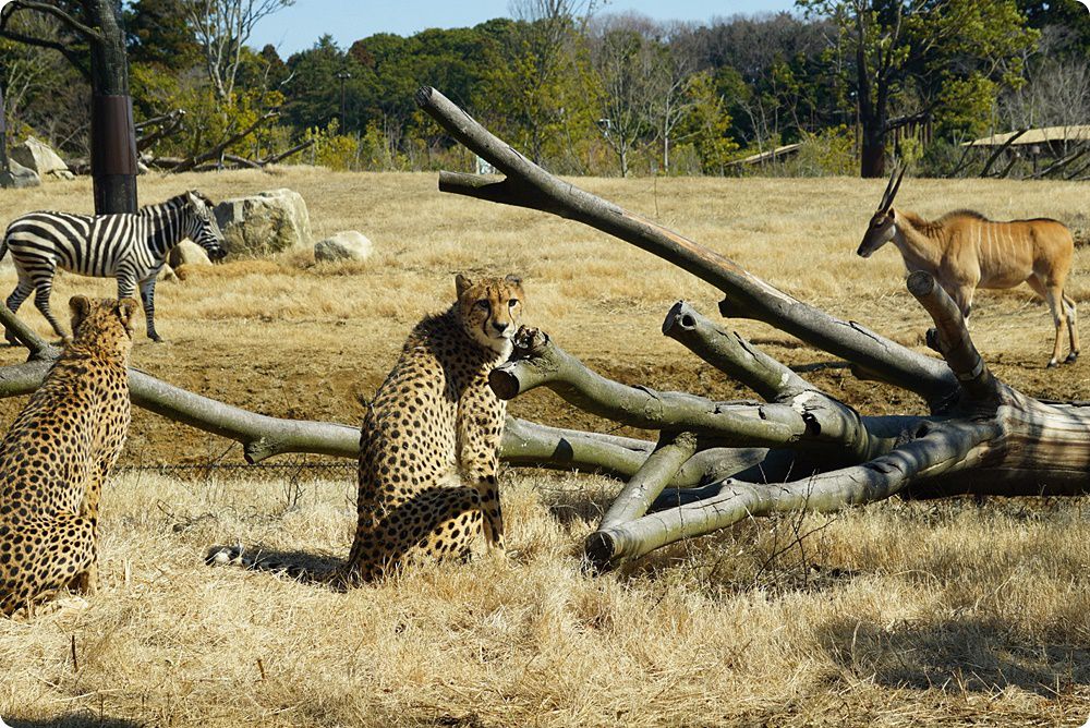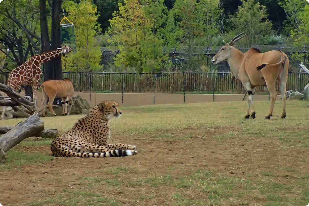 Az előző példánál is komplexebb társaskifutó létrehozásáról kell említést tennünk a Yokohamai Állatkertből: az intézmény 2015-ben megnyitott „Afrikai szavanna” bemutatója egy területen mutat be gepárdokat, zebrákat, jávorantilopokat és zsiráfokat. Ez tekinthető az első alkalomnak Japánban, hogy egy állatkert három nagytestű növényevőfajt mutat be egy ragadozófajjal társbérletben. A fajkombináció sikere azon viselkedésbeli jellegzetességen alapul, miszerint a gepárdok alapvetően nem támadnak meg náluk nagyobb prédaállatot, így az említett patások kifejlett egyedeivel történő együtt tartás nem jelenthet problémát. Az igen tágas, 8200 m² alapterületű társaskifutó szomszédságában egy kisebb területrész található, mely a gepárdok elkülönítésére szolgál a patások utódnevelési időszakában. A vegyesfajú kifutó megfelelő menedzsmentjének fontos eleme, hogy a macskafélék biztonságos, kellő távolságot tudjanak tartani a nagytestű növényevőktől, hiszen a zebrák és jávorantilopok gyakran kitérésre késztetik, elkergetik a közelükből azokat. Ennek megfelelően a közösen használt területen belül több ponton fatörzsekkel körbevett, védőzónaként funkcionáló „szigetek” kerültek kialakításra a gepárdok nyugalmának biztosítása érdekében (WATANABE 2018, sz. k.).