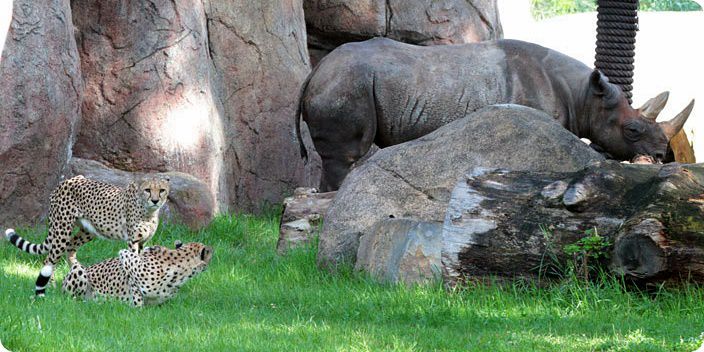 Dél-afrikai gepárdok (Acinonyx jubatus jubatus) és kelet-afrikai keskenyszájú orrszarvú (Diceros bicornis michaeli)