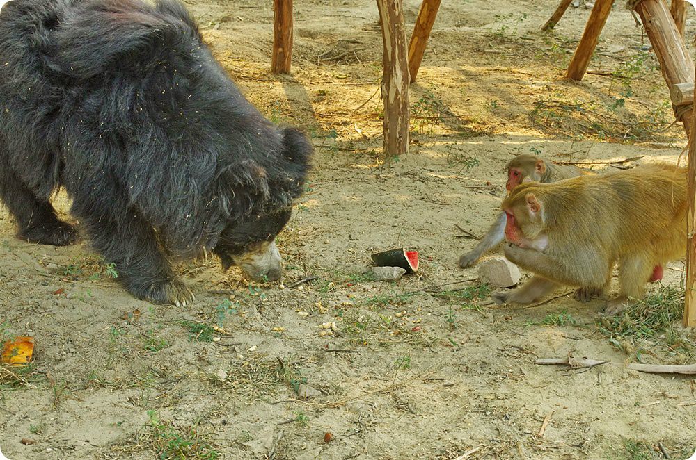 Ajakos medve (Melursus ursinus) és bundermakákók (Macaca mulatta) az indiai Wildlife SOS intézményben