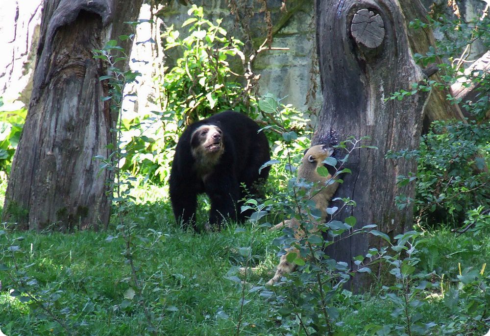 Pápaszemes medve (Tremarctos ornatus) és vörösorrú ormányosmedve (Nasua nasua) a Zürich-i Állatkertben