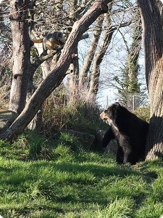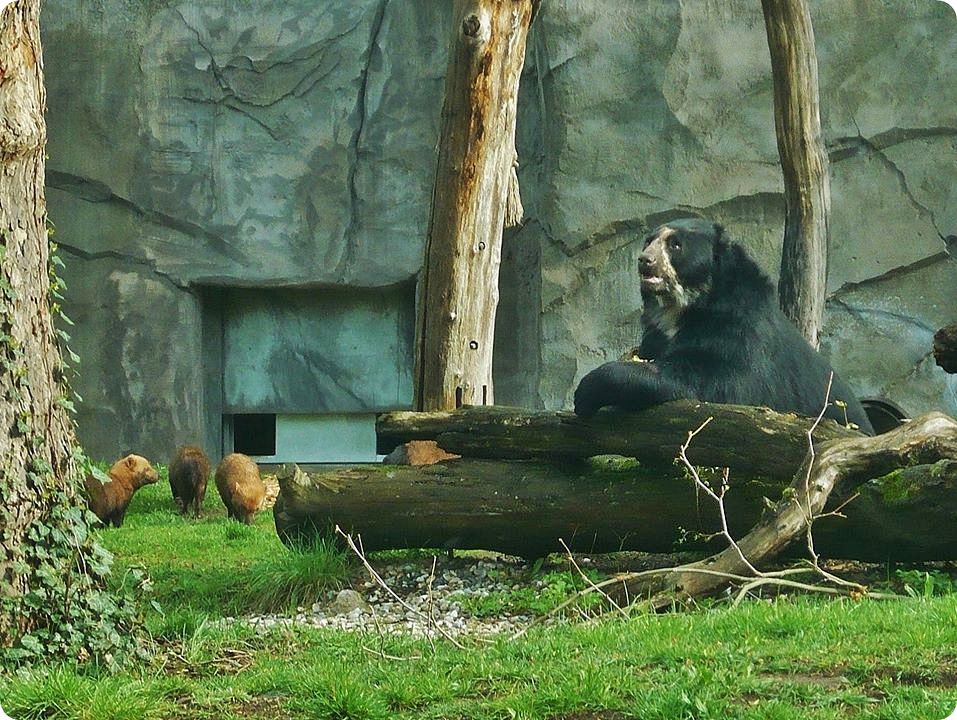 Pápaszemes medve (Tremarctos ornatus) és vörösorrú ormányosmedvék (Nasua nasua) az Antwerpeni Állatkertben