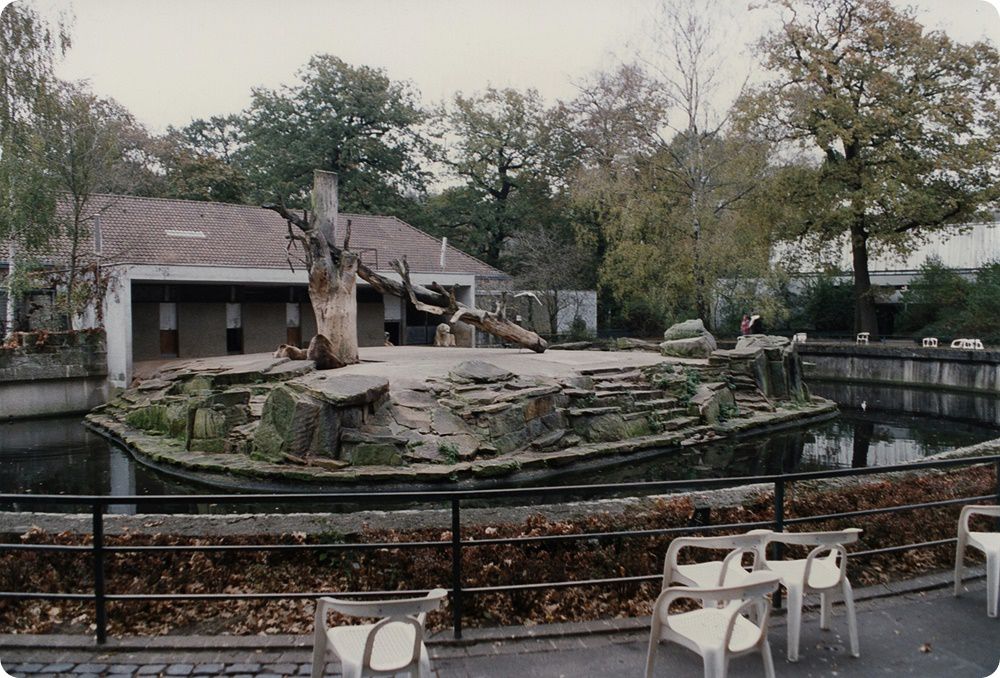 Maláj medvék (Helarctos malayanus) és binturongok (Arctictis binturong) többféle aljzattal, búvóhellyel és mászási lehetőséggel gazdagon ellátott társaskifutójának részlete az Arnhemi Állatkertben. A medve fölött, egy farönkön pihenő binturong is látható.