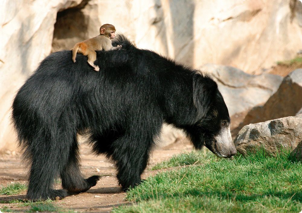 Ajakos medve (Melursus ursinus) hátán utazó fiatal bundermakákó (Macaca mulatta) a Lipcsei Állatkertben