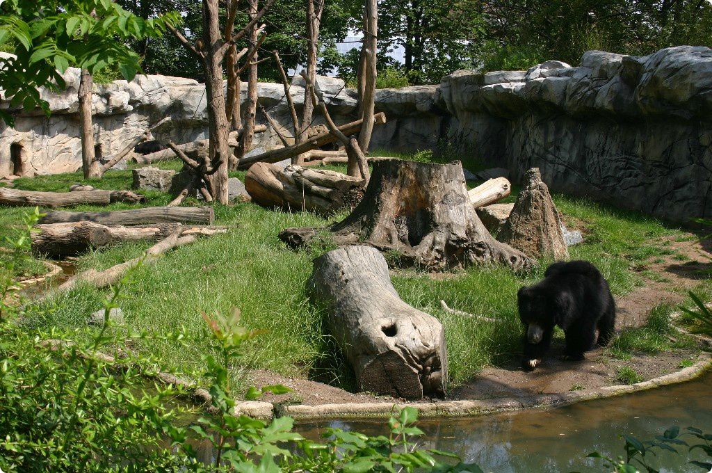 Ajakos medvék (Melursus ursinus) és bundermakákók (Macaca mulatta) társaskifutójának részlete Lipcsében