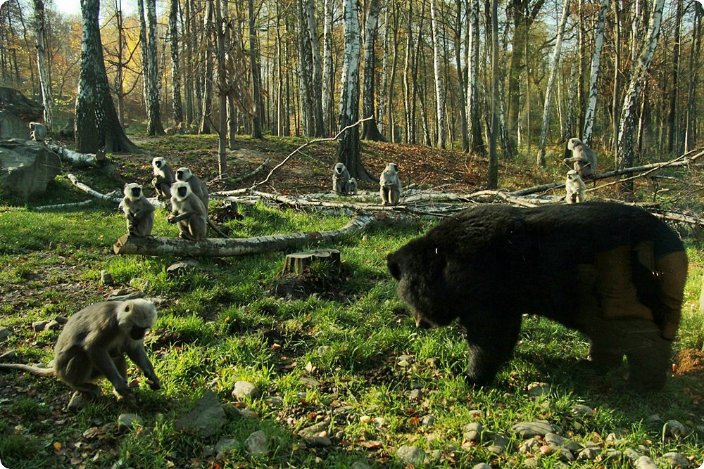 A pápaszemes medvék főemlősökkel történő összeszoktatása egyéb európai kertekben is megfigyelhető. Antwerpenben és Doué-la-Fontaine-ben bolíviai mókusmajmok (Saimiri boliviensis boliviensis), míg Frankfurtban szintén déli bőgőmajmok a medvék társbérlői.