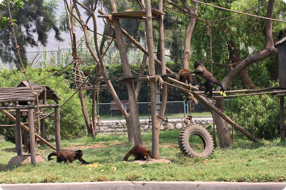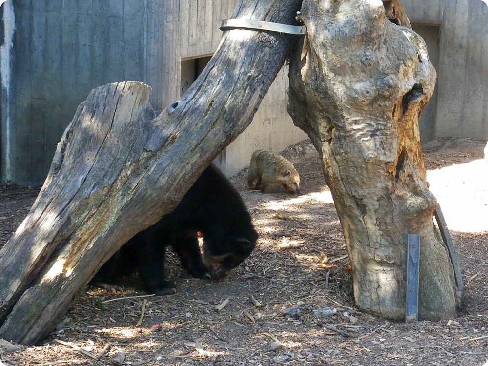 A Los Angeles-i Állatkert néhány évtizede társaskifutón mutatta be vörösorrú ormányosmedvéit és Geoffroy-pókmajmait. Egy kíváncsi majom elpusztult sérülésében, melyet vélhetően egy ormányosmedve okozott (CROTTY 1981, HAMMER 2002).