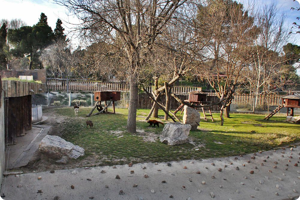 Madridban korábban mind maláj medvével, mind pápaszemes medvével közösen is bemutatta vörösorrú ormányosmedvéit, ám miután az utolsó idős egyed is elpusztult, felhagytak a kisragadozók tartásával, így jelenleg egyik kombináció sem látható már. A társasbemutató igen jól működött, az intézmény nem tapasztalt problémát a fajok között: az ormányosmedvék számára a medvék által nem elérhető területek is biztosítottak volta, melyekre a megfigyelések szerint azonban nem is volt kifejezetten szükség (DELCLAUX 2018, sz. k.).