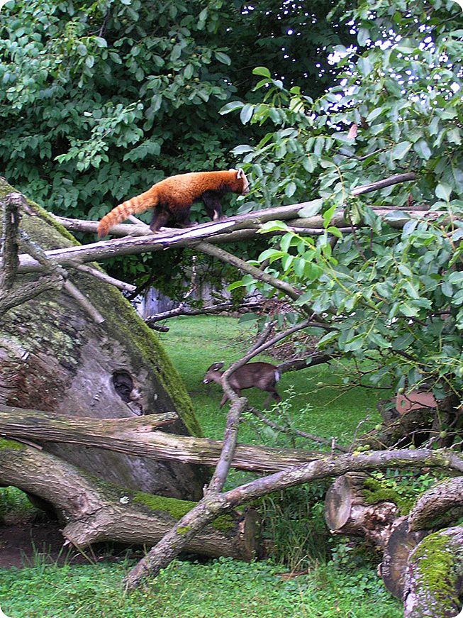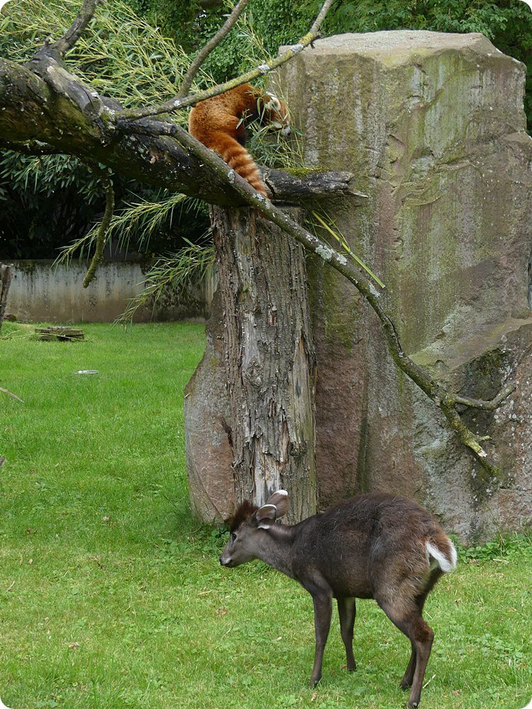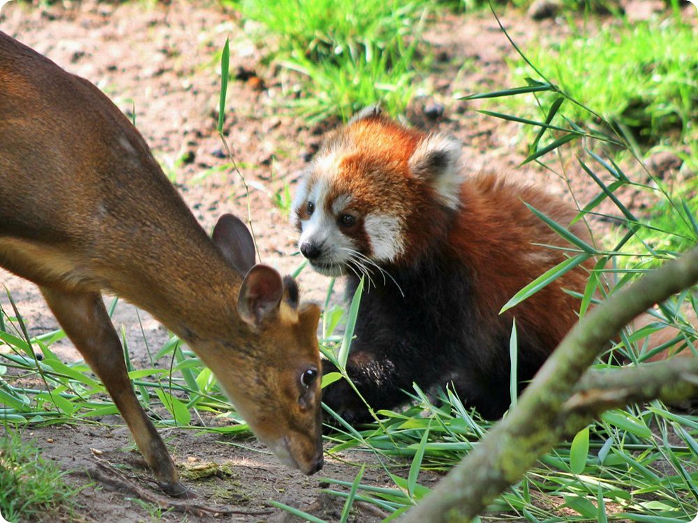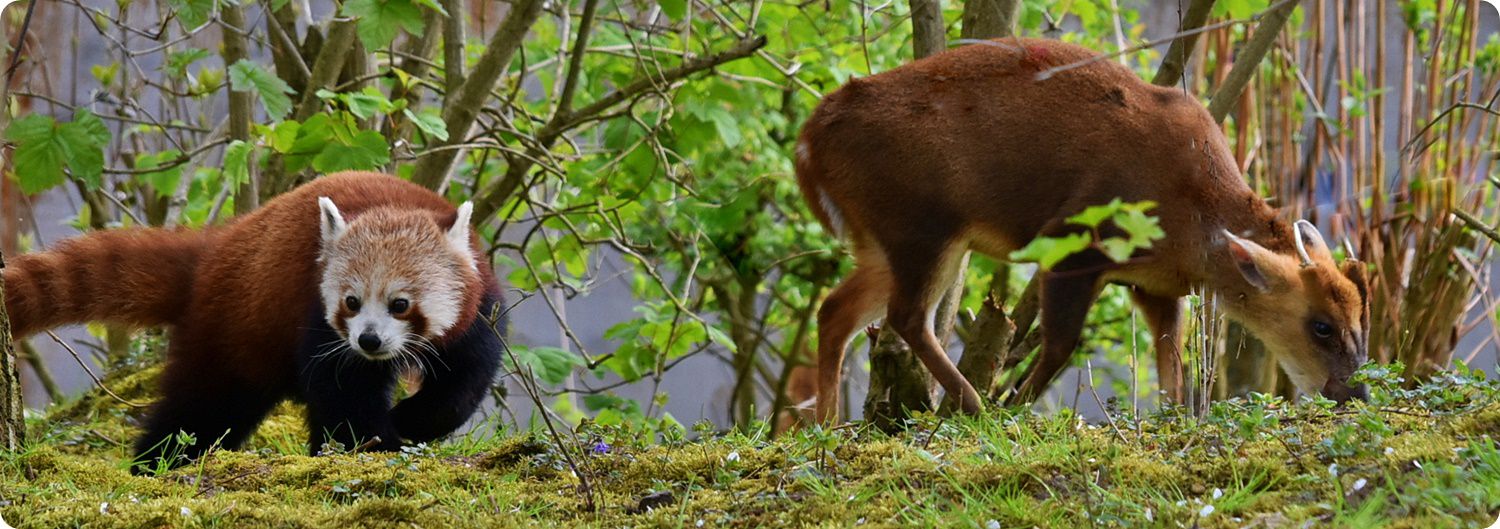 Nyugati vörös macskamedve v. kis panda (Ailurus fulgens fulgens) és kelet-kínai bóbitás szarvas (Elaphodus cephalophus michianus)
