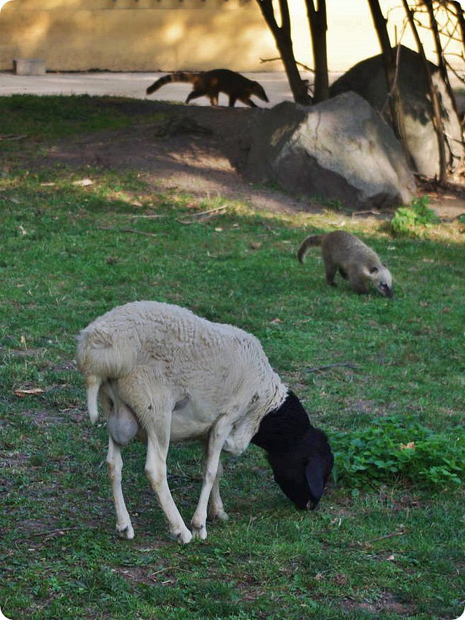 A cseh Chomutov-i Állatparkban házi juhokkal, egész pontosan Quessant törpe juhokkal közös erdei területen láthatóak az észak-amerikai mosómedvék, mely fajkombináció teljesen problémamentesnek bizonyul (BRTNICKŶ 2018, sz. k.).