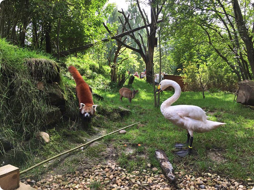 A holland GaiaZOO vörös macskamedvéi a Reeves-muntyákszarvasok mellett további két fajjal, bütykös ásóludakkal és kis hattyúkkal kerülnek közös bemutatásra. A társaskifutó sikeresen működik, de a gondozóknak külön figyelmet szükséges szentelniük arra, hogy mindegyik faj megfelelően megkapja saját takarmányát (BOER 2018, sz. k.).