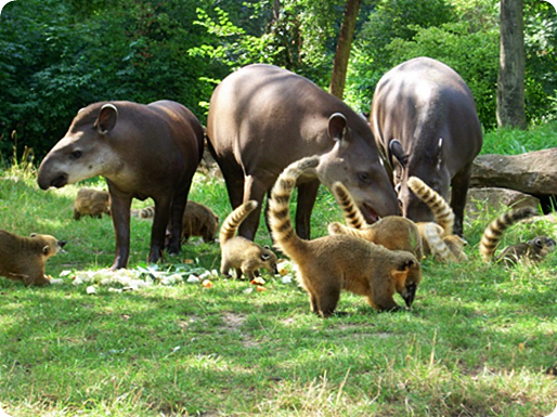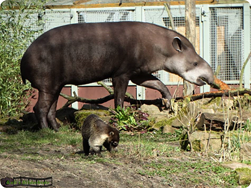 A Magdeburgi Állatkert Amazónia bemutatójában egy szokatlan társasbemutatóra bukkanhatunk, ahol vörösorrú ormányosmedvék (5.1) és fehérorrú ormányosmedvék (1.2) vegyesivarú csapata él dél-amerikai tapírokkal közösen. Mindkét koati faj szaporodik a bemutatóban. A külső kifutón az együttélés nem okoz problémát, az ormányosmedvék és tapírok idejük nagy részében nem foglalkoznak egymással. Néha előfordul, hogy a koatik vakaródznak vagy pihennek a tapírokon, sőt játék közben rájuk ugranak, mely „kényeztetés” láthatóan tetszik a nagytestű növényevőknek. Az ormányosmedvék továbbá fekvőhelyeket készetenk maguk számára a fákon, mely tovább növeli a fajok közötti elkülönülés lehetőségét. A fajkombináció a belső férőhelyen nem volt folytatható, mivel az ormányosmedvék arra „használták” a tapírokat, hogy azok hátáról kiugrottak a belső látogatói térbe, valamint az egész napos összezárás túlzott mértékű, vakaródzásban jelentkező „zaklatást” jelentett a nagyobb társbérlők irányába (RUSKE 2018, sz. k.).