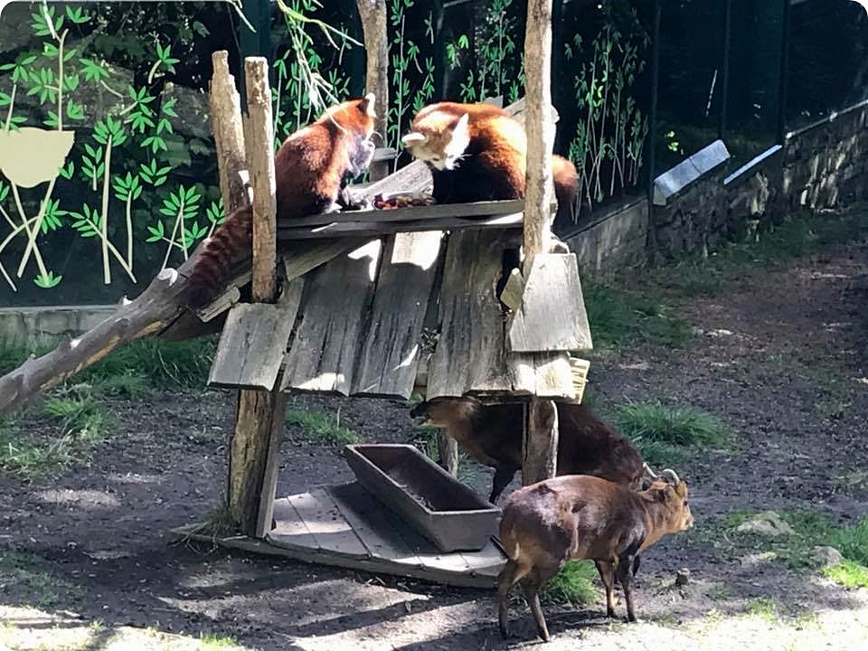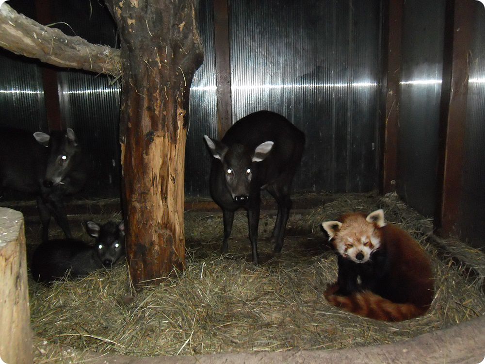 Nyugati vörös macskamedvék v. kis pandák (Ailurus fulgens fulgens), Reeves-muntyákszarvasok (Muntiacus reevesi) és indiai antilopok (Antilope cervicapra) közös kifutója