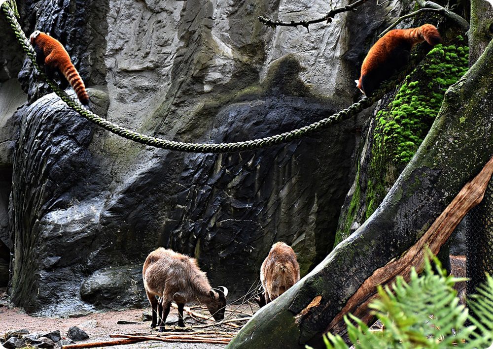 Nyugati vörös macskamedvék v. kis pandák (Ailurus fulgens fulgens) és himalájai tahrok (Hemitragus jemlahicus)