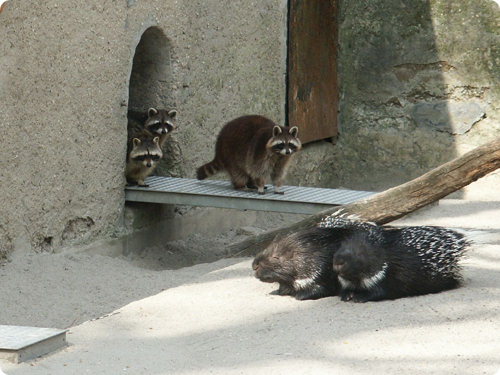 A mosómedvék és tarajossülök társítása problémamentesen működött a Heidelbergi Állatkertben. E kombináció csupán ideiglenes megoldásként szolgált addig, míg a mosómedvék új kifutójukba költözhettek. Mindkét faj esetében szaporulat idején néhány napra/hétre el kellett különíteni a fajokat (REICHLER-DANIELOWSKI 2018, sz. k.).