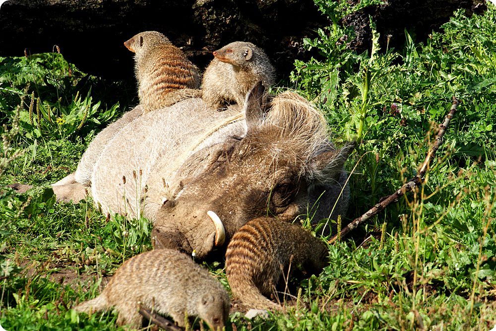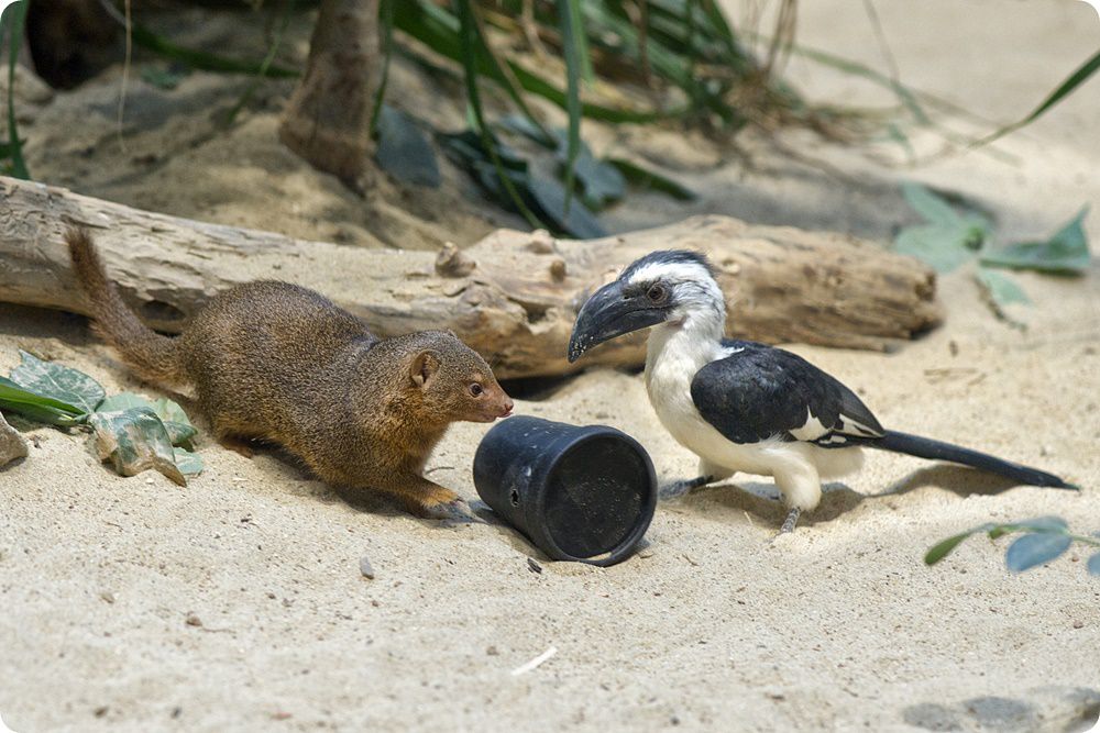 Érdekességként mindenképpen megjegyzendő, hogy a mutualizmus, mint az „új generációs” állatkerti társaskifutók egy alapköveként értelmezhető koncepció éppen bizonyos mongúzfajok – mint a szurikáta (Suricata suricatta) és sárga mongúz (Cynictis penicillata), de kiváltképp a törpemongúz (Helogale parvula) és zebramongúz (Mungos mungo) – vegyesfajú kifutón történő elhelyezése esetén játszhat fontos szerepet.