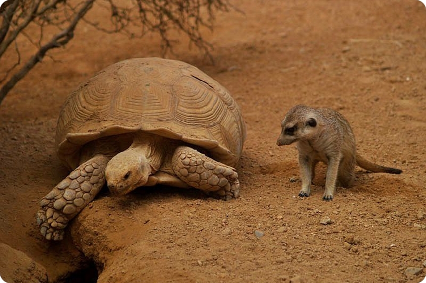 Szurikáta (Suricata suricatta) és sarkantyús teknős (Centrochelys sulcata)