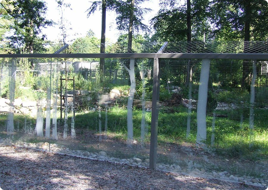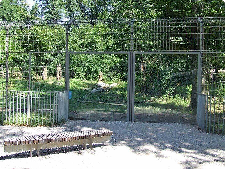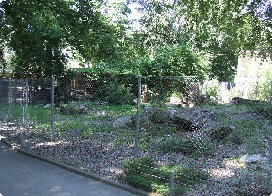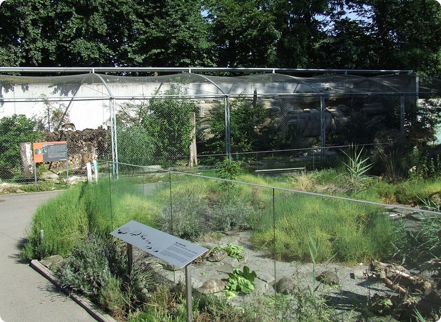 Szegélyes teknős kifutó, a vadmacskák (Felis silvestris silvestris) ketrecével a háttérben (balra), viperák, valamint siklók közös szabadtéri terráriumai (jobbra)